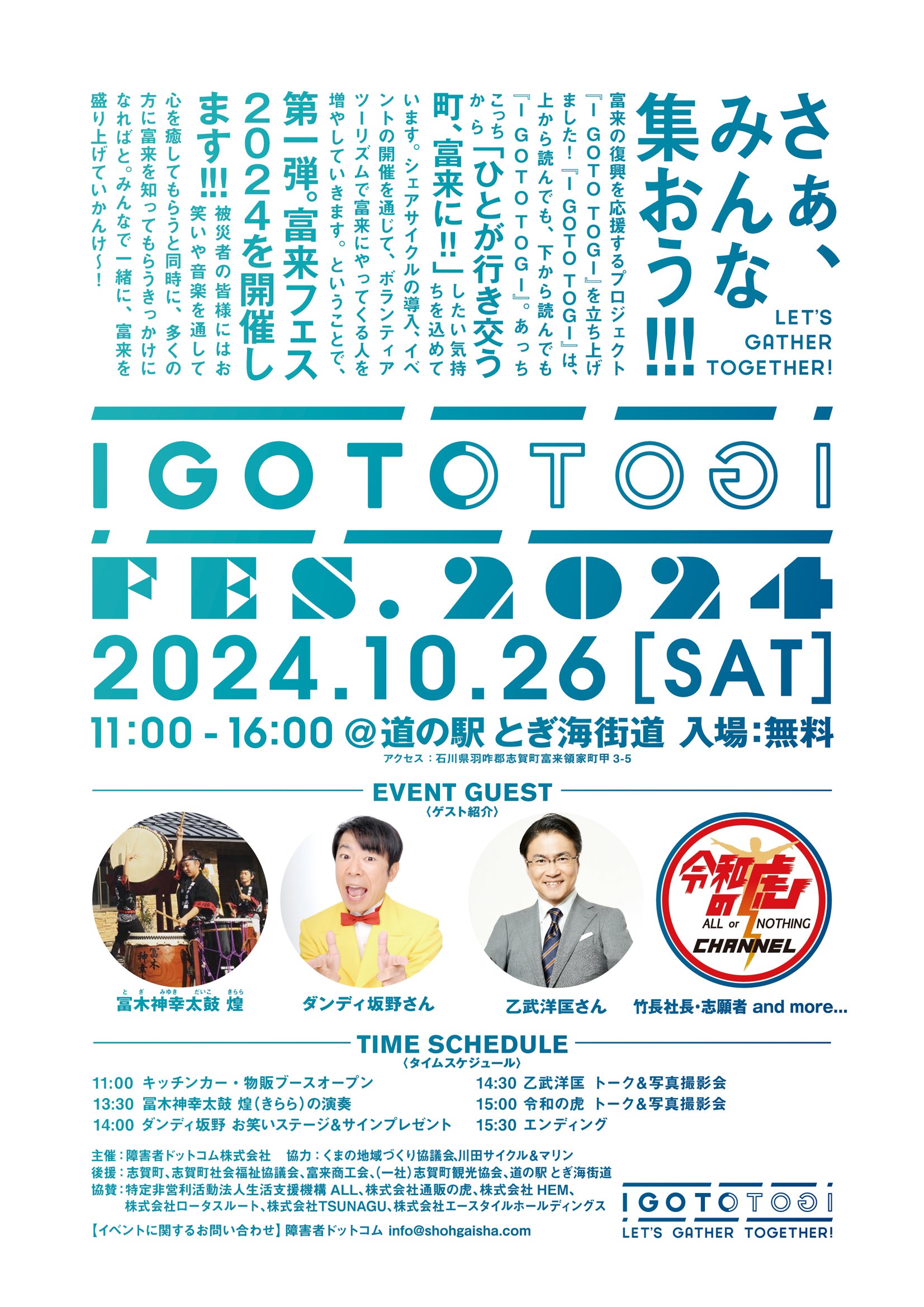 目標金額を達成することは叶いませんでしたが、皆さまからのご協力のおかげで、たくさんのご支援をいただき無事にプロジェクトを終了することができました。心より感謝申し上げます。支援総額:2,000,000円支援者数:178人※プロジェクトの詳細https://camp-fire.jp/projects/view/783894【I GOTO TOGI Tシャツ】【I GOTO TOGI ステッカー】のリターンをご支援いただいた皆さまには、リターンをを発送しました!温かいご支援をいただいた皆さま、誠にありがとうございます。今後も、Tシャツやステッカーの販売を続けながら、シェアサイクルの導入を進め、富来を復興させるための支援を募っていきます。下記URLからご購入いただけますので、ぜひともご覧ください。https://igototogi.base.shop/富来の町に活気を取り戻すために、引き続き皆さまのご支援をどうぞよろしくお願いいたします。