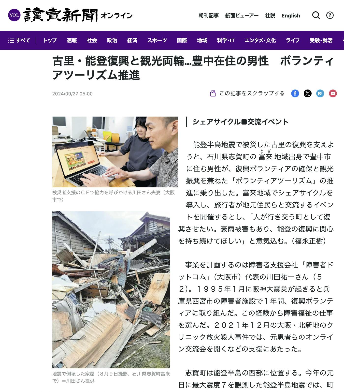 10月27日の読売新聞オンライン、読売新聞大阪版に掲載されました!
