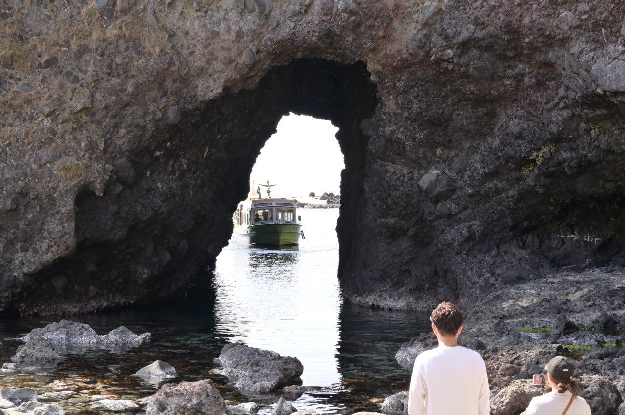 世界一長いベンチから望む増穂浦海岸 2024年8月10日撮影能登金剛を代表する巌門。奥行きが60メートルもある大きい洞門です。この巌門洞窟をはじめ、鷹の巣岩、碁盤島、日本最古の木造灯台(旧福浦灯台)を巡る遊覧船が出ていて、海上からの眺めもまた迫力満点です。