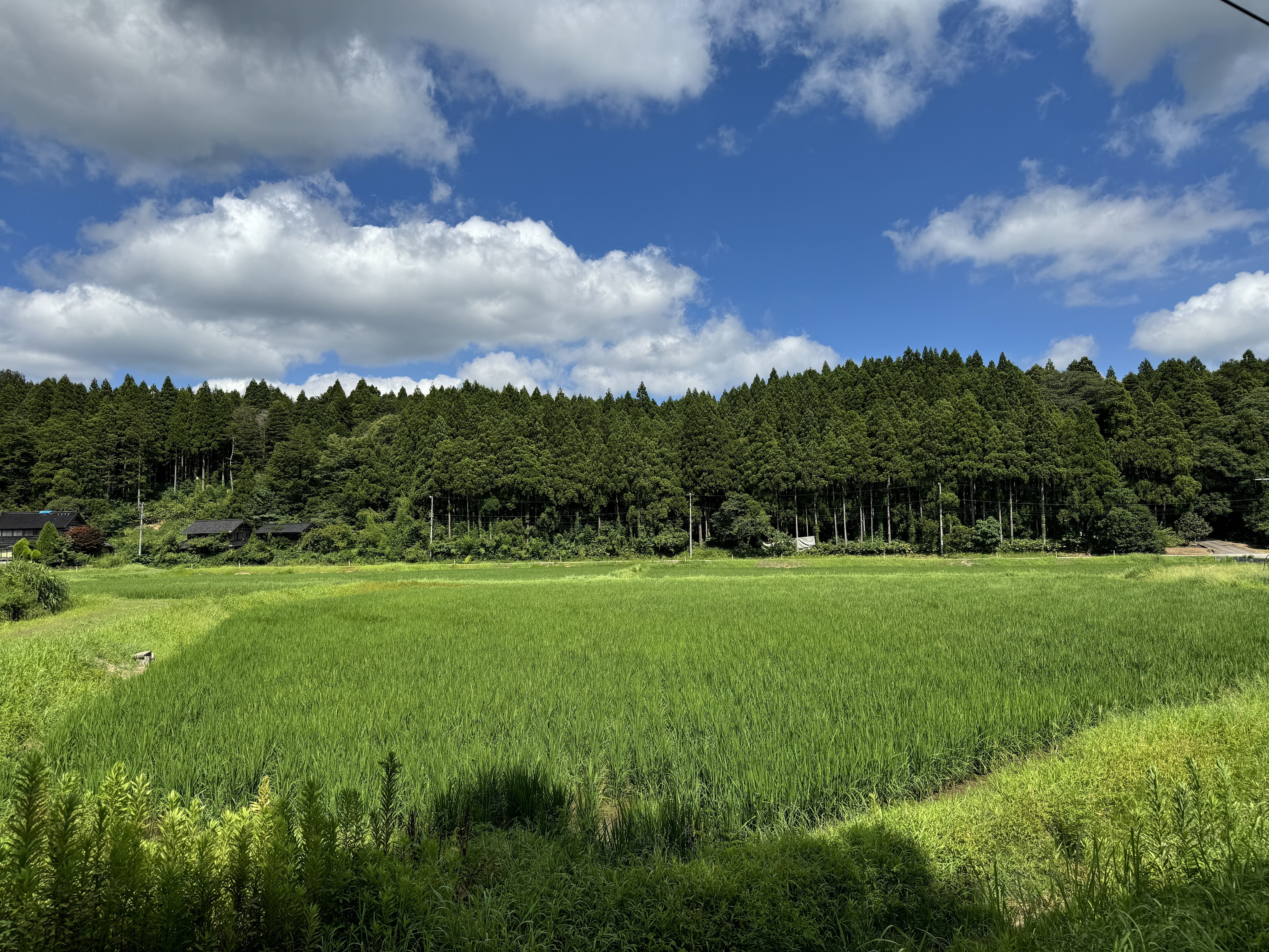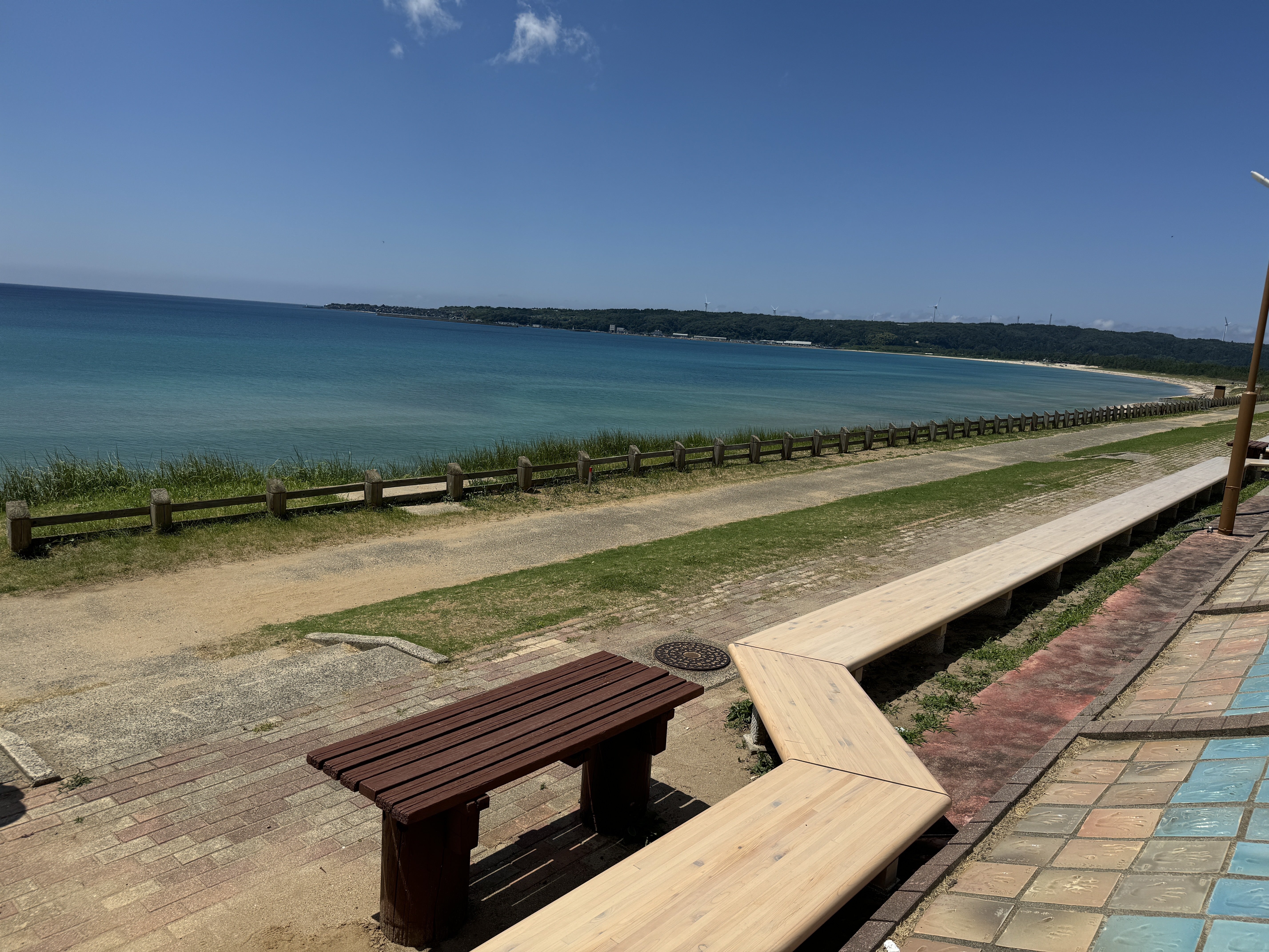 富来の田園風景 2024年8月10日撮影志賀町海岸線一帯は「能登金剛」と呼ばれ、中でも増穂浦海岸は絶景です。この海岸に沈む夕日は格別です。また、世界一長いベンチがあり、この名所は「サンセットヒルイン増穂」と呼ばれ、その愛称は私の伯父が名付けました。