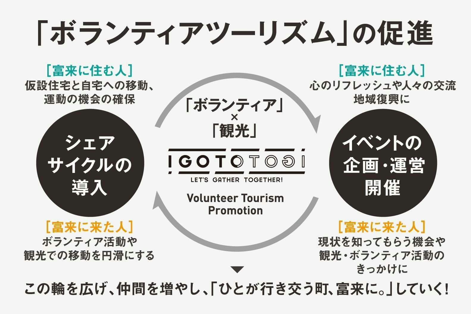 『I GOTO TOGI』の起爆剤として、震災をきっかけに富来に住む人と富来に来る人とが交流できるイベントを定期的に開催します。「このイベントがあるから富来に行こう」、「ボランティアや観光の一貫としてイベントに参加しよう」という人を増やすことで、たくさんの人たちを巻き込み、人が行き交う町 富来にしていきます。行政、災害ボランティアセンター、観光協会、商工会、福祉施設などと協力して一体になってこのイベントを盛り上げていきたいです。ゆくゆくは、このイベントがボランティアツーリズムのプランの中に組み込まれ、このイベントに参加すること自体がボランティアになる仕組みも考えています。