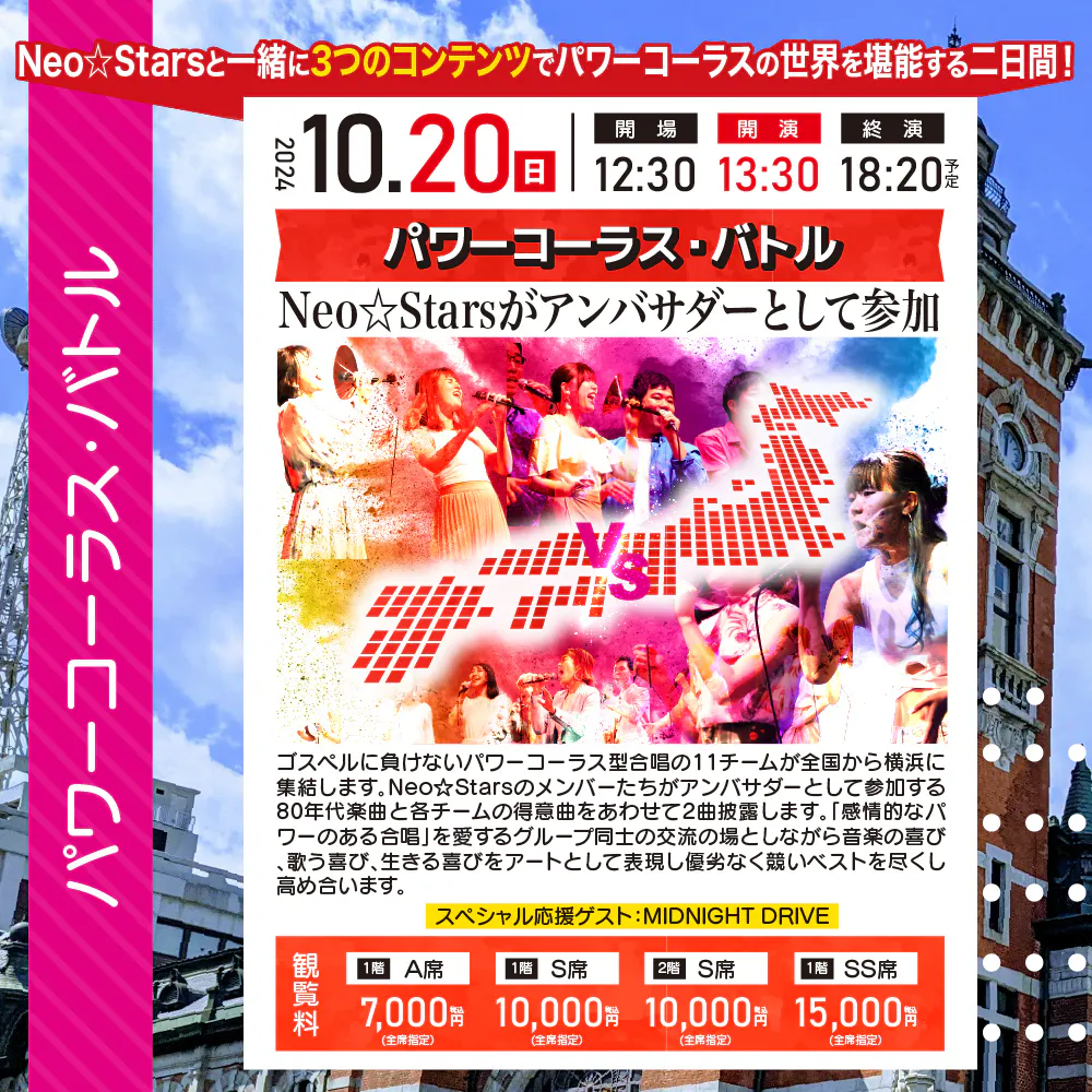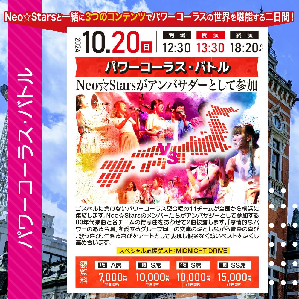 2024年10月20日(日)パワーコーラス・バトル:開場12:30 開演13:30 終演18:20 (予定)ネオ☆スターズがアンバサダーとして率いる全国からの合唱チーム11組が参加する合唱バトル♪