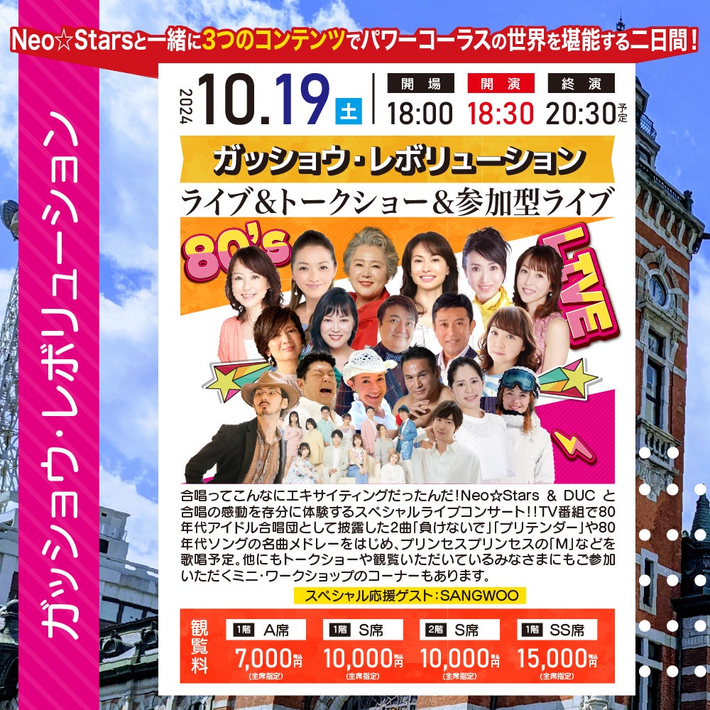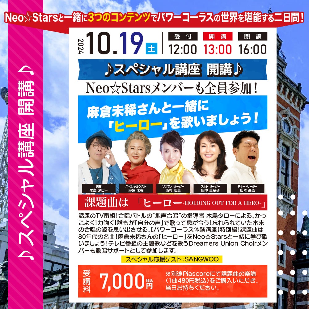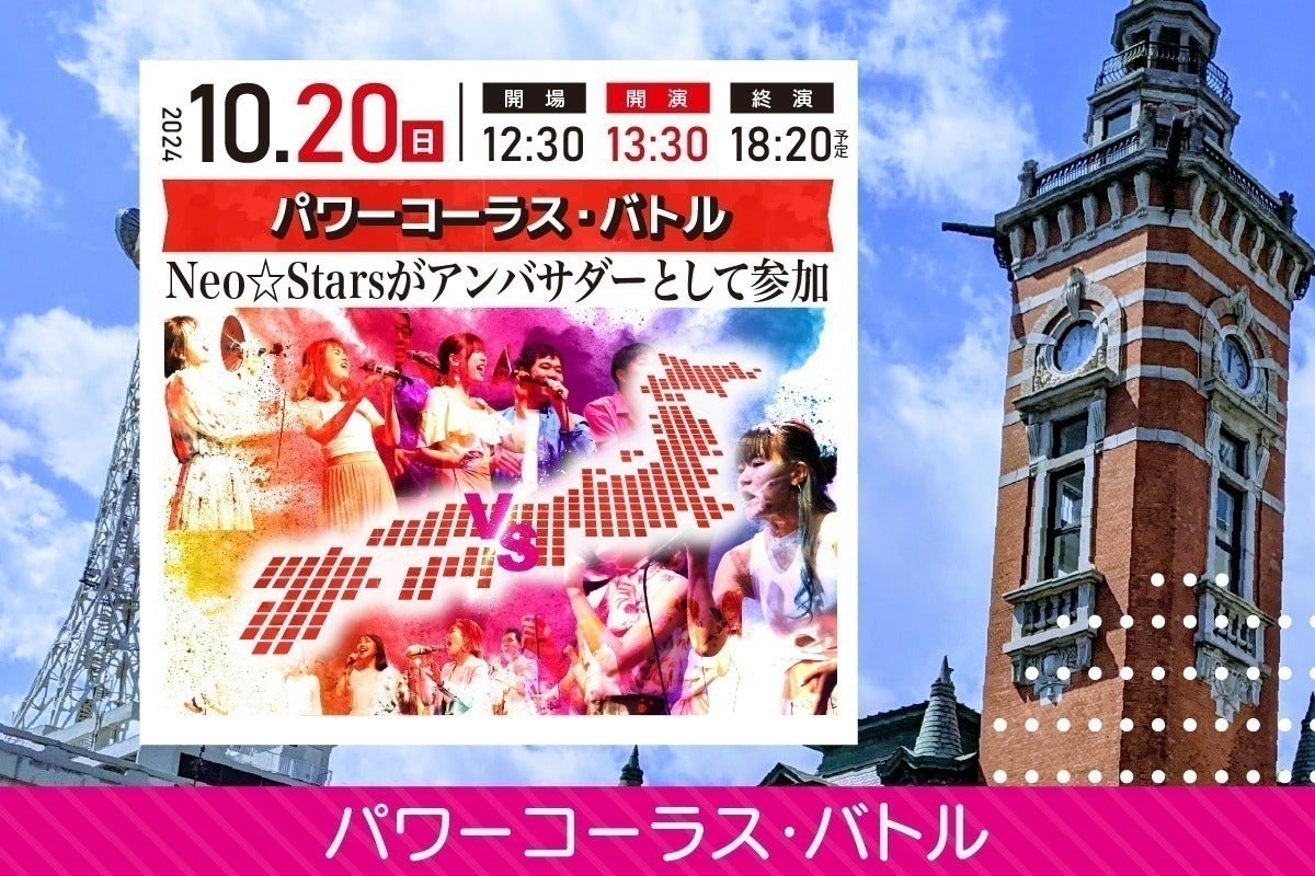 2024年10月20日(日)パワーコーラス・バトル:開場12:30 開演13:30 終演18:20 (予定)ネオ☆スターズがアンバサダーとして率いる全国からの合唱チーム11組が参加する合唱バトル♪