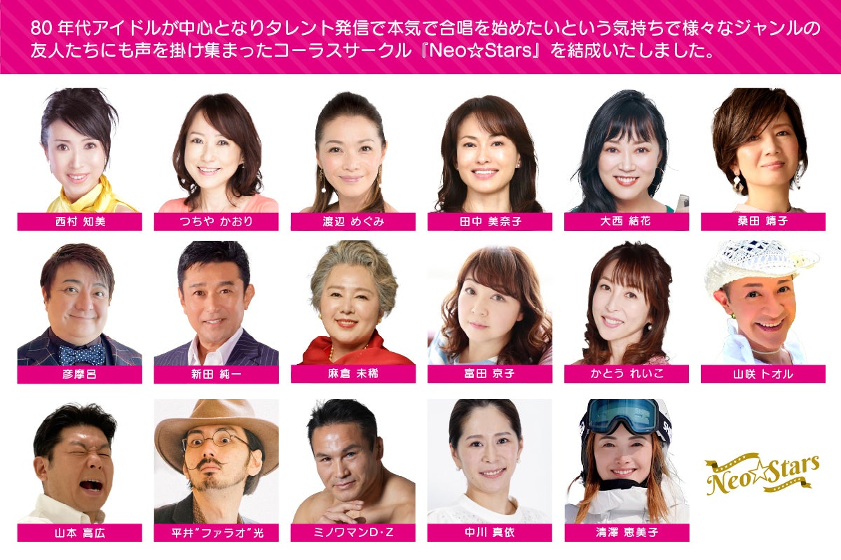 80年代当時は個々で戦って来たメンバーが、この「合唱バトル」をきっかけに心一つに互いを尊重し合い、感動的な時間を共に過ごし戦友から親友へとなりました。この体験は、キャリアを重ねて来たメンバーたちにとっても新鮮かつ忘れられない出来事となりました。番組に出演した「80年代アイドル合唱団」の仲間たちの中から、渡辺めぐみさん、つちやかおりさん、西村知美さん、そして私、田中美奈子の4名が発起人となり、80年代アイドルが中心となりタレント発信で本気で合唱を始めたいという気持ちで様々なジャンルの友人たちにも声を掛け集まったコーラスサークル『Neo☆Stars』を結成いたしました。