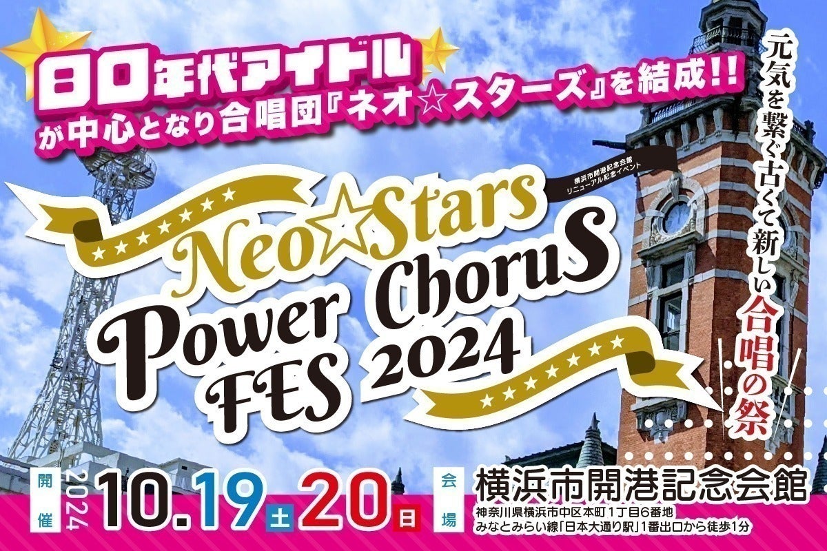 2023年5月放送「昭和平成令和のヒット曲を100人が熱唱!オールスター合唱バトル」(フジテレビ系列特番)に「80年代アイドル合唱団」として出演し、合唱の魅力の虜になった田中美奈子等が中心となり、『Neo☆Stars』を結成しました。 番組の合唱を通じて、「私たちもまだまだもっと出来る」「みんなで集まってまた何かをやりたいね」という個々の思いが湧き起こり、番組終了後に再集結を決意。80年代当時は個々で戦って来たメンバーがこの「合唱バトル」をきっかけに心一つに互いを尊重し合い、感動的な時間を共に過ごし戦友から親友へとなりました。この体験は、キャリアを重ねて 来たメンバーたちにとっても新鮮かつ忘れられない出来事となりました。『Neo☆Stars』とは合唱に心震え感動的な時間を共に過ごした80年代アイドルが中心となりタレント発信で本気で合唱を始めたいという気持ちで様々なジャンルの方々にも声を掛け、集まったコーラスサークルです。合唱を愛する様々なジャンルからもメンバーが集結します! 活気に満ちた「地声合唱=パワーコーラス」で昭和100年Pre-Yearを盛り上げ、「音楽があふれる街=横浜」の魅力を発信します。舞台は改修リニューアルでその魅力が再注目される横浜市開港記念会館。100年以上に渡り国際都市ヨコハマの文化拠点として港町の発展を見つめ続け「ジャック」の愛称でも呼ばれる国の重要文化財です。この機会に横浜市民はもちろん、全国の方々へ向け改めて、最高にエキサイティングで、時には人を癒し、人の魅力を何倍にも輝かせる、あの80年代アイドルたちが夢中になった合唱の素晴らしさをお伝えすると共に、横浜を音楽で盛り上げていくイベントとなるように尽力します。