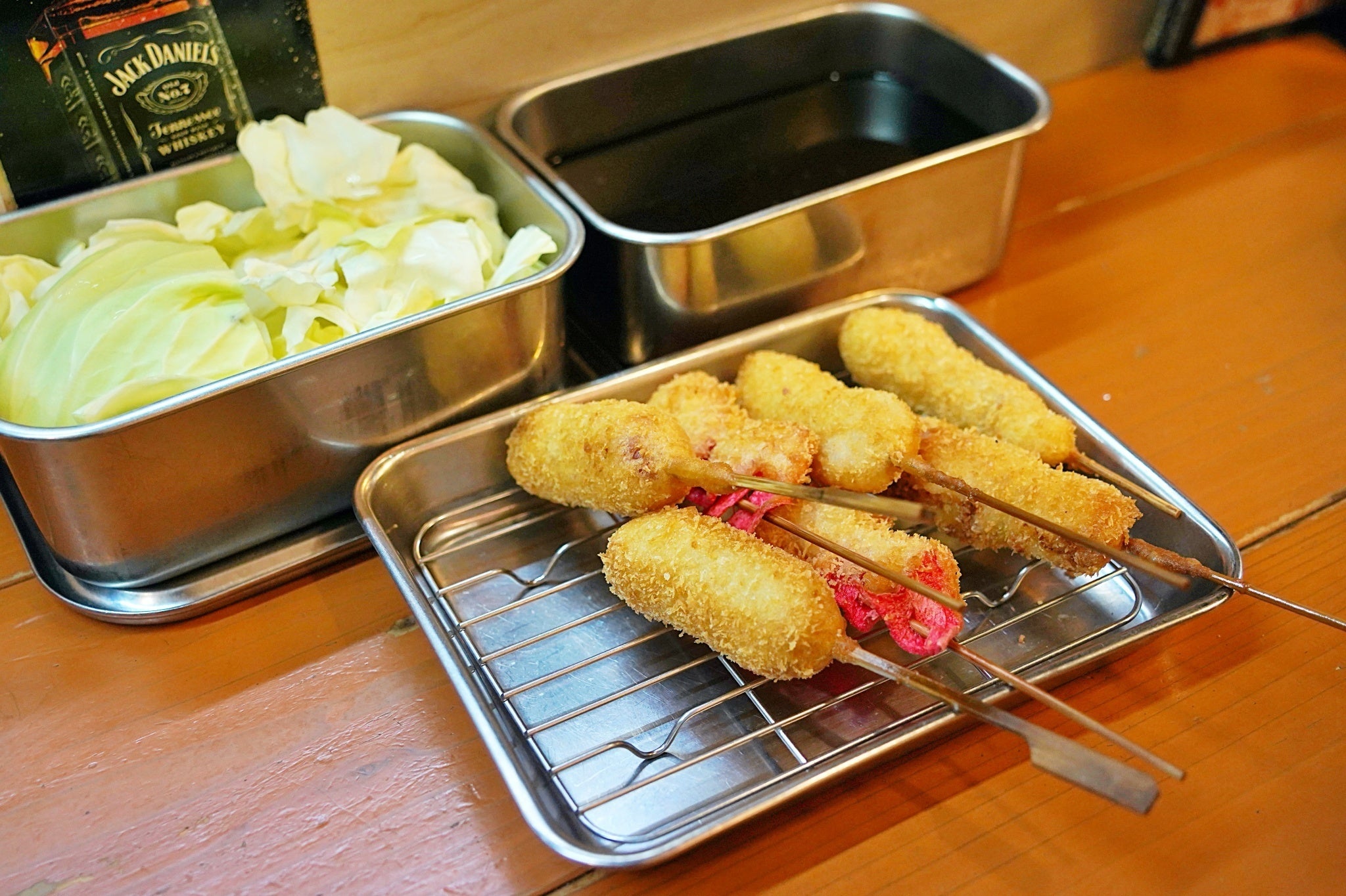 新世界の串かつの代名詞、厚手の衣で外カリ中フワで提供。山芋をたっぷり使って極細のパン粉をまとった衣は、フワフワで噛めばもっちりとした食感。