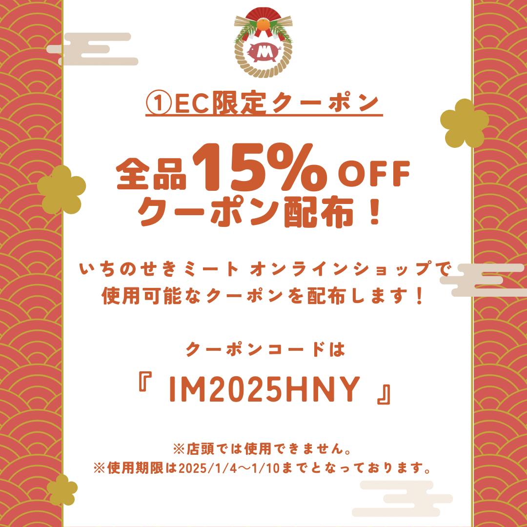 ① EC限定クーポン配布いちのせきミートオンラインショップ限定で全品15%OFFになるクーポンをご利用いただけます!