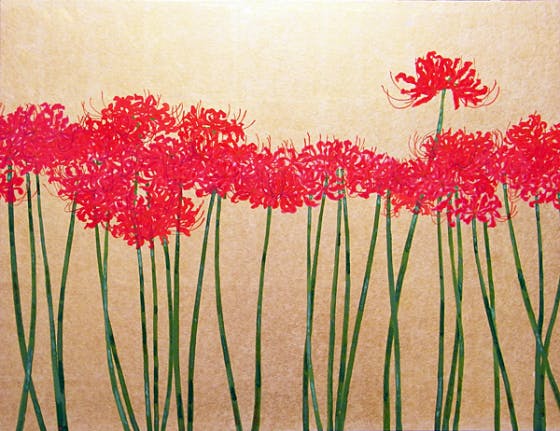 遠目は印刷にも見れる柄のような花、しかし近くで見る事により典具帖紙を張られた金、銀箔がみられ筆で描かれた事が理解できる。一見印刷でいいような作品だが筆の動き、癖のある花のかたちなどをとることにより花の中での動きを作る。既成のデザインでは生みだせない、従来の日本画の良さ、一点ものの価値を探っている。