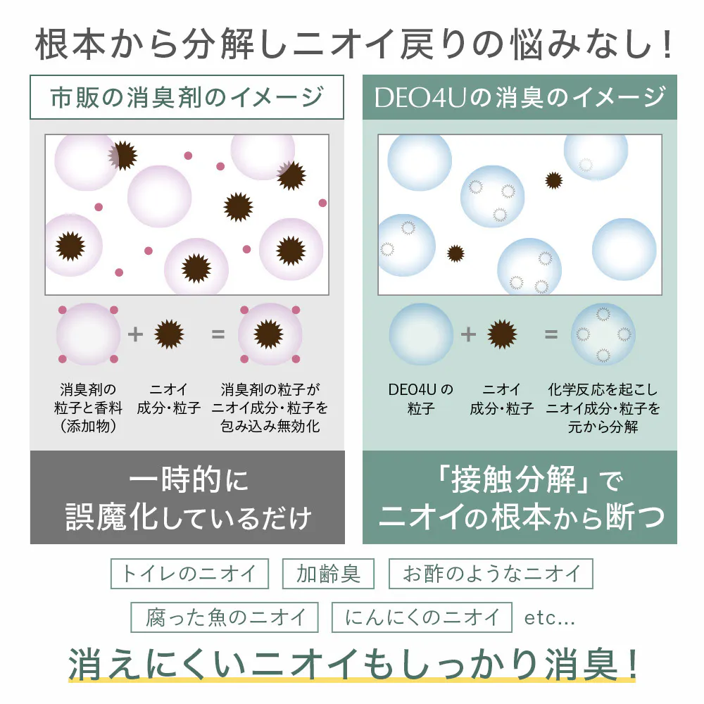 お気に入りの香水や柔軟剤を使っているからそのにおいまで消したくない…そんな方でも大丈夫。DEO 4Uはイヤな臭いだけを取り除くので、好きなニオイの邪魔にはならないのでご安心ください。