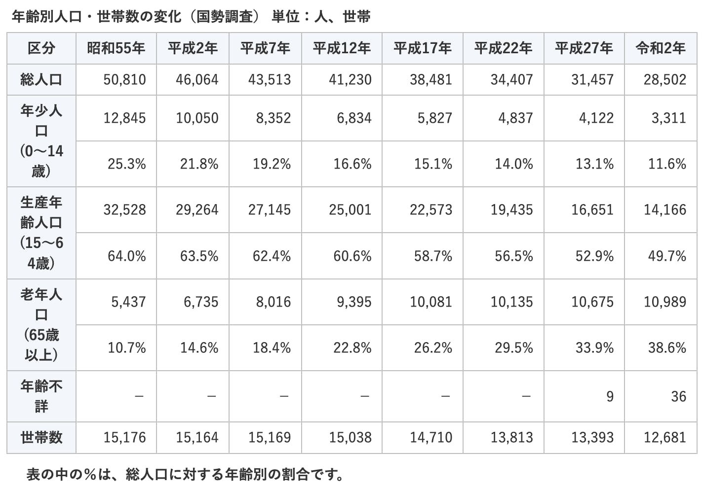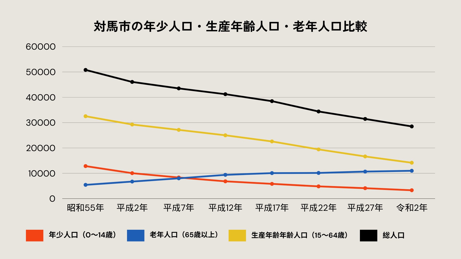 対馬市しまぐらしガイド「年齢別人口・世帯数の変化(国勢調査)」より