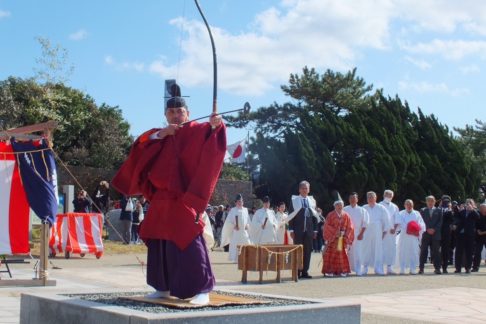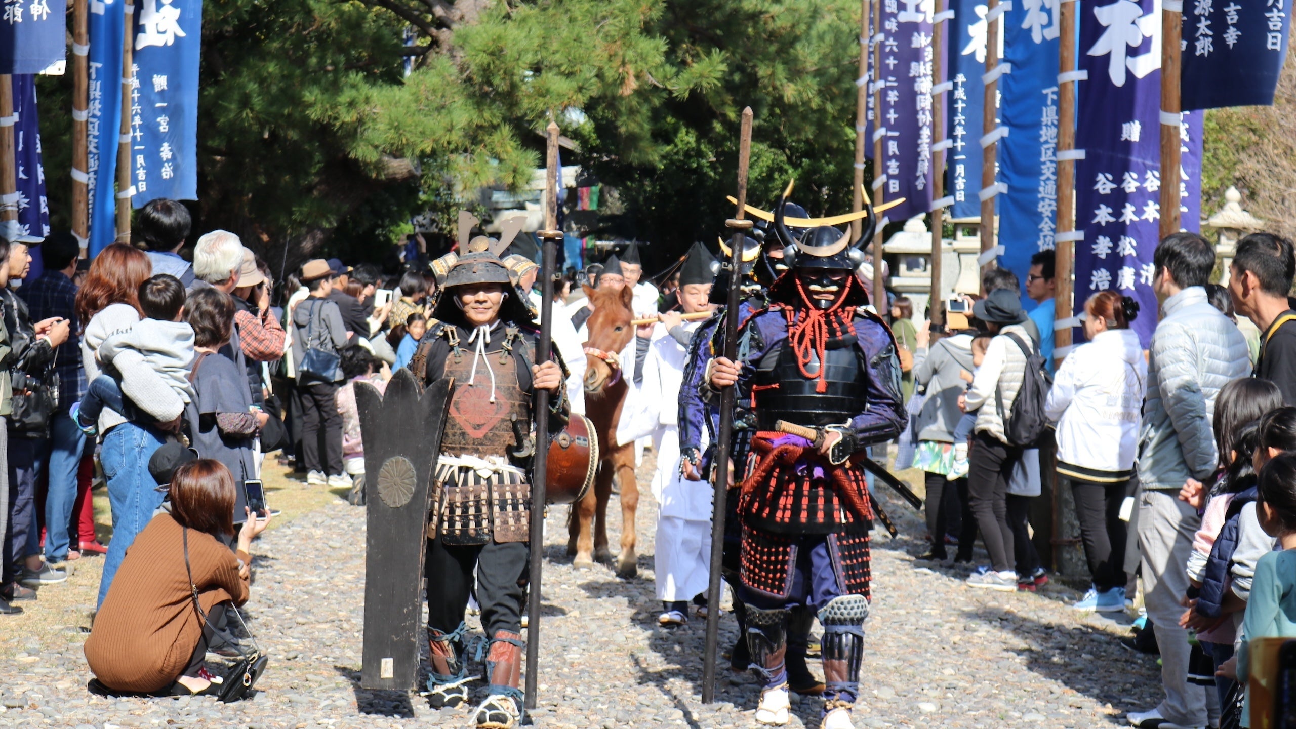 武士の子孫たちが鎧を着て小茂田浜に集う「武者行列」、神主が海に向かって弓矢を構え弦を三度穿つ「鳴弦の儀」や奉納太鼓で賑わいます。また、宗助国公や家臣たちが小茂田浜の戦いに向かう際に食べたと伝承される「豆もち」の販売もあります(大人気で毎年すぐに売り切れます)。
