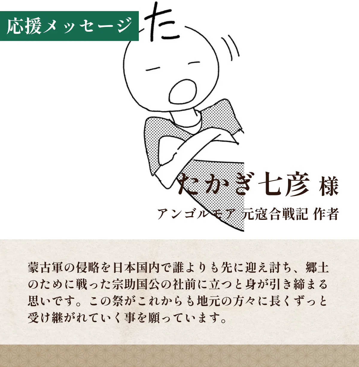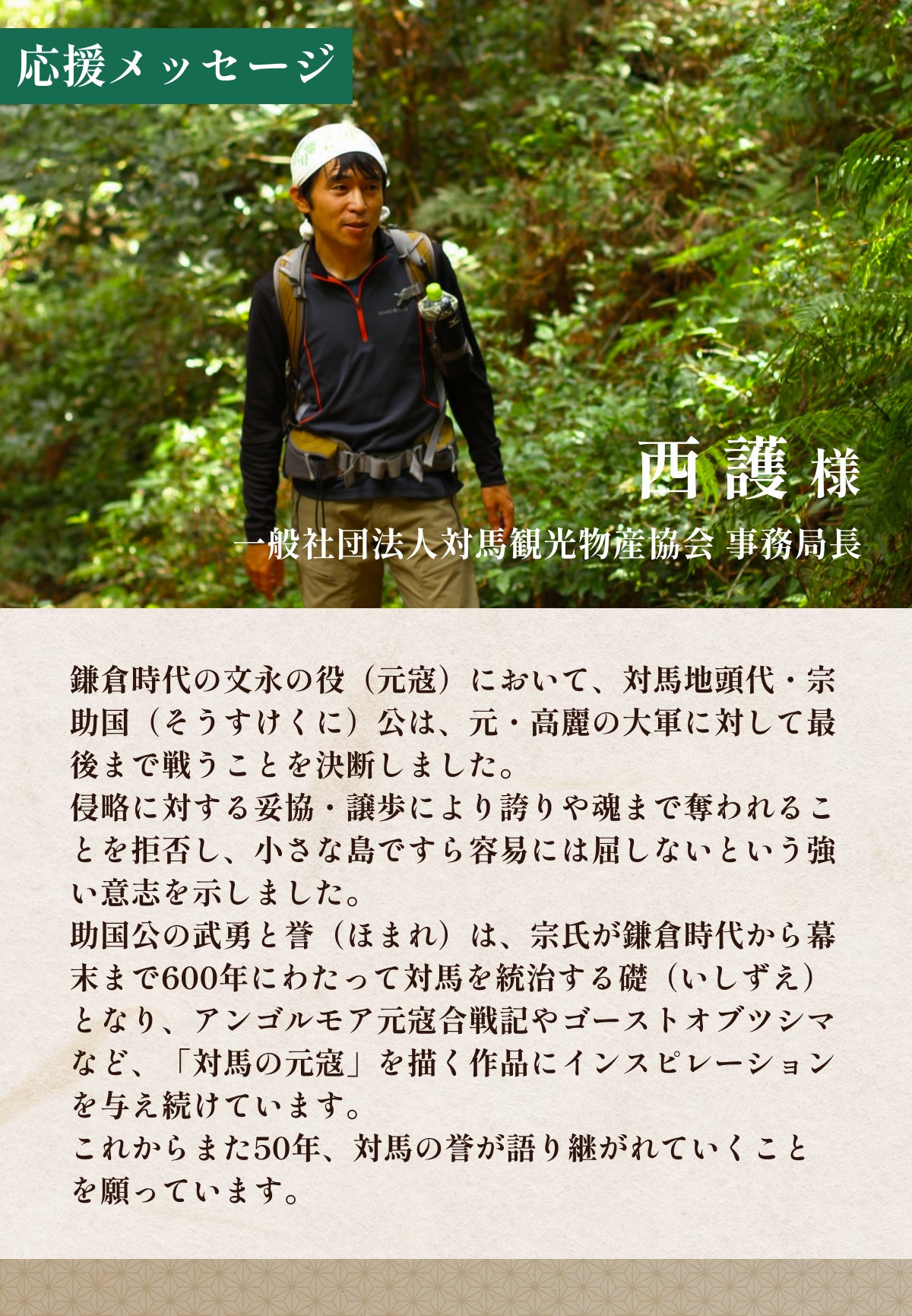 「宗助国公はわずか80余騎の軍勢で約3万ともいわれる蒙古軍と、御国を守るため、家をも身をも打ち忘れ、勇猛果敢に戦ったその雄姿は、750年に亘ってご先祖様によって後世に語り継がれてきました。我々はその使命を受け継ぎ、語り継ぐべき責務があると思っております」