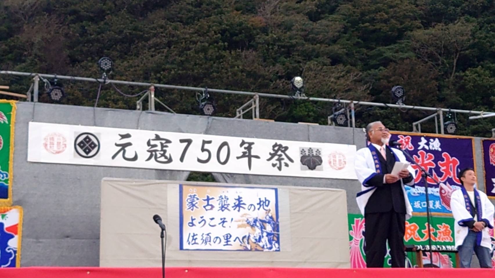700年祭実行委員会では、亡き父が会長を務めていたので、当時の実行委員の人たちの活気ある行動と寄付集め等に奔走していたことをよく覚えています。今回の750年祭で私が実行委員会の会長になったことには非常に縁を感じています。この機会に「元寇」について改めて学び、歴史を多くの人に知ってもらう機会になればと思います。威力をもって侵略すること、命を懸けて護ること。そこには多くの犠牲が生じたこと。そのため世界で紛争が起きている今こそ、元寇を知ることで島の平和や繁栄を願う機会にしたい思うと共に50年後の800年祭でも地域の住民が協力し、歴史ある小茂田浜神社大祭を盛大に開催してくれる事を心から願っています。どうか皆様の力強いご支援をお願いいたします。