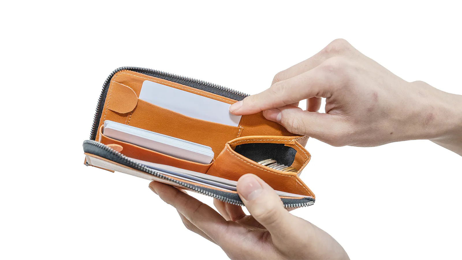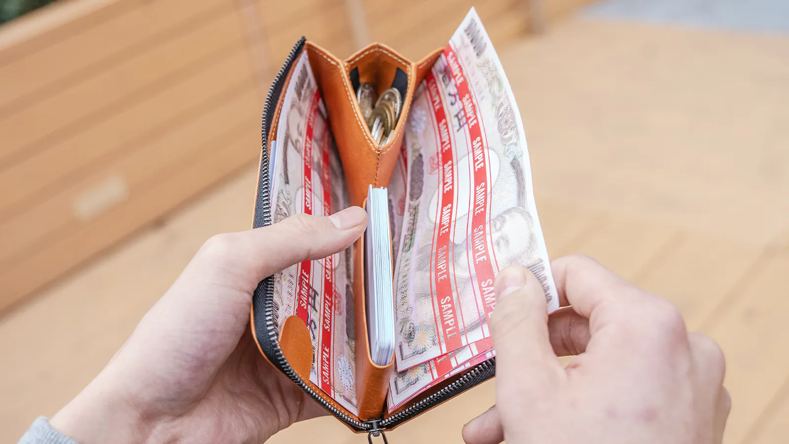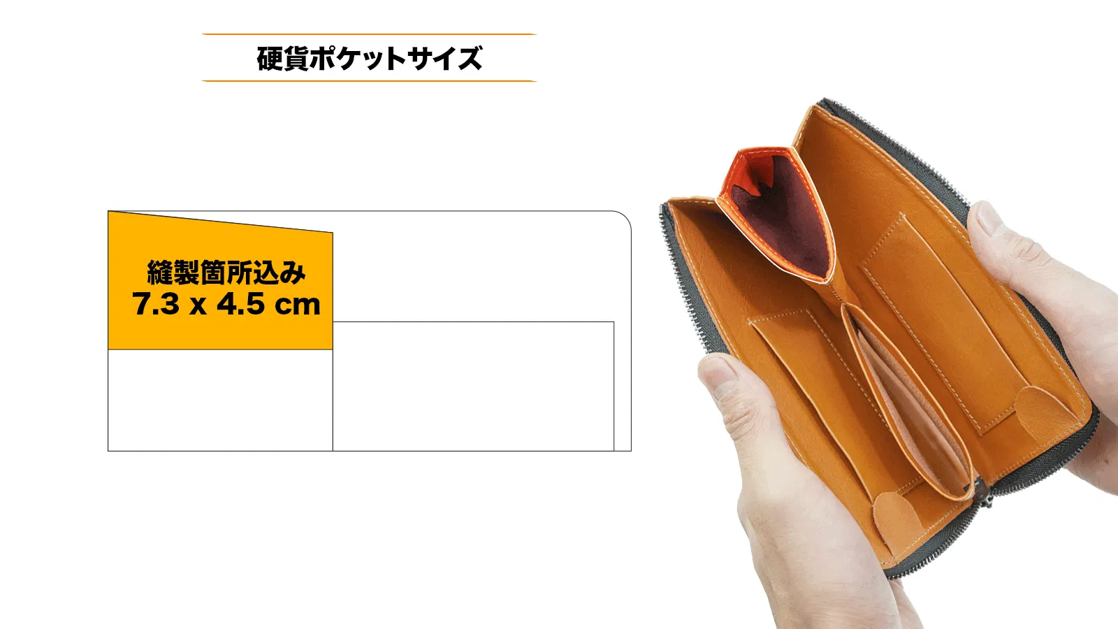 小さなスペースながら一定の量を収納することが可能で、財布を広げると同時に口が広がる構造になっています。
