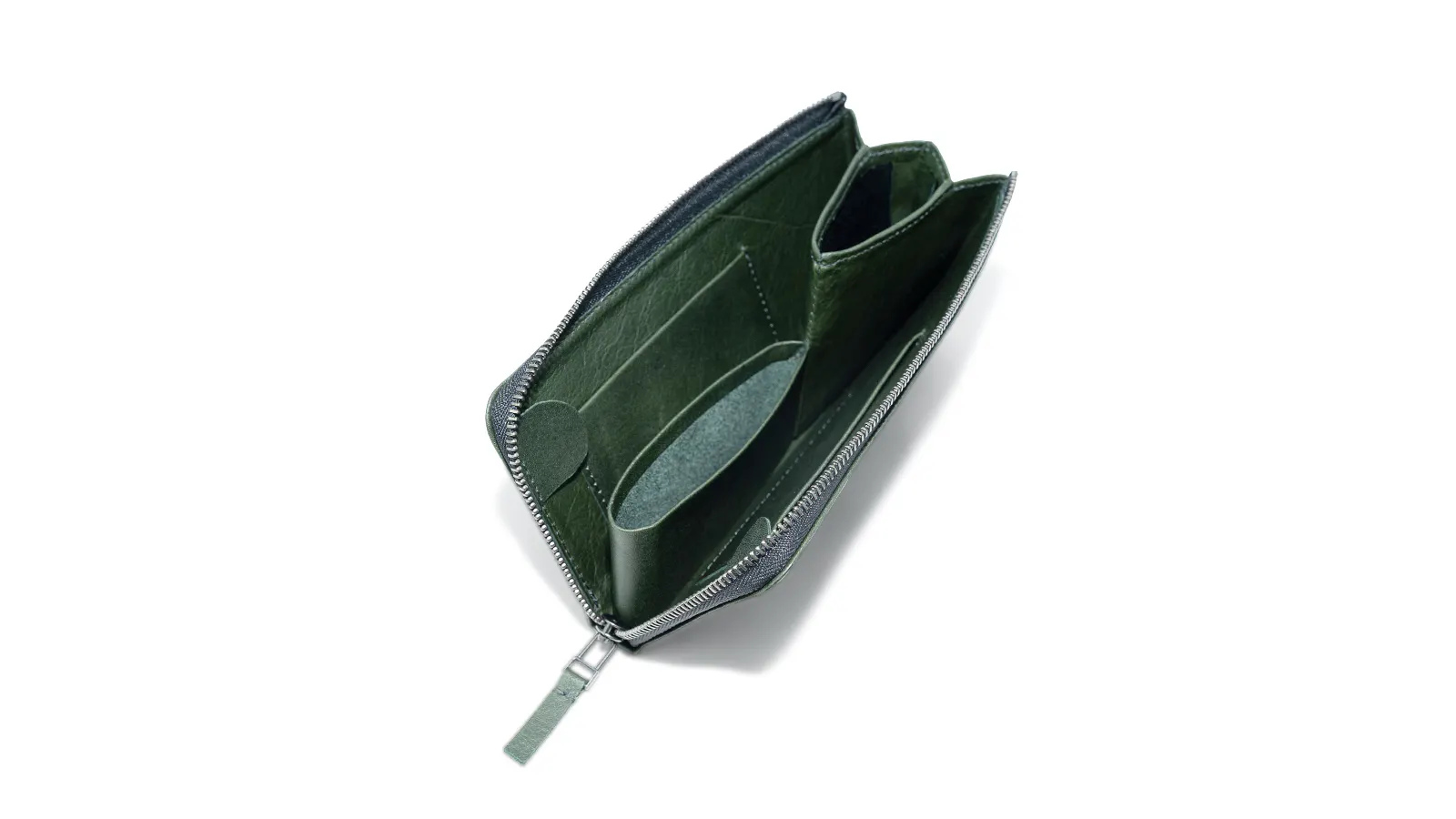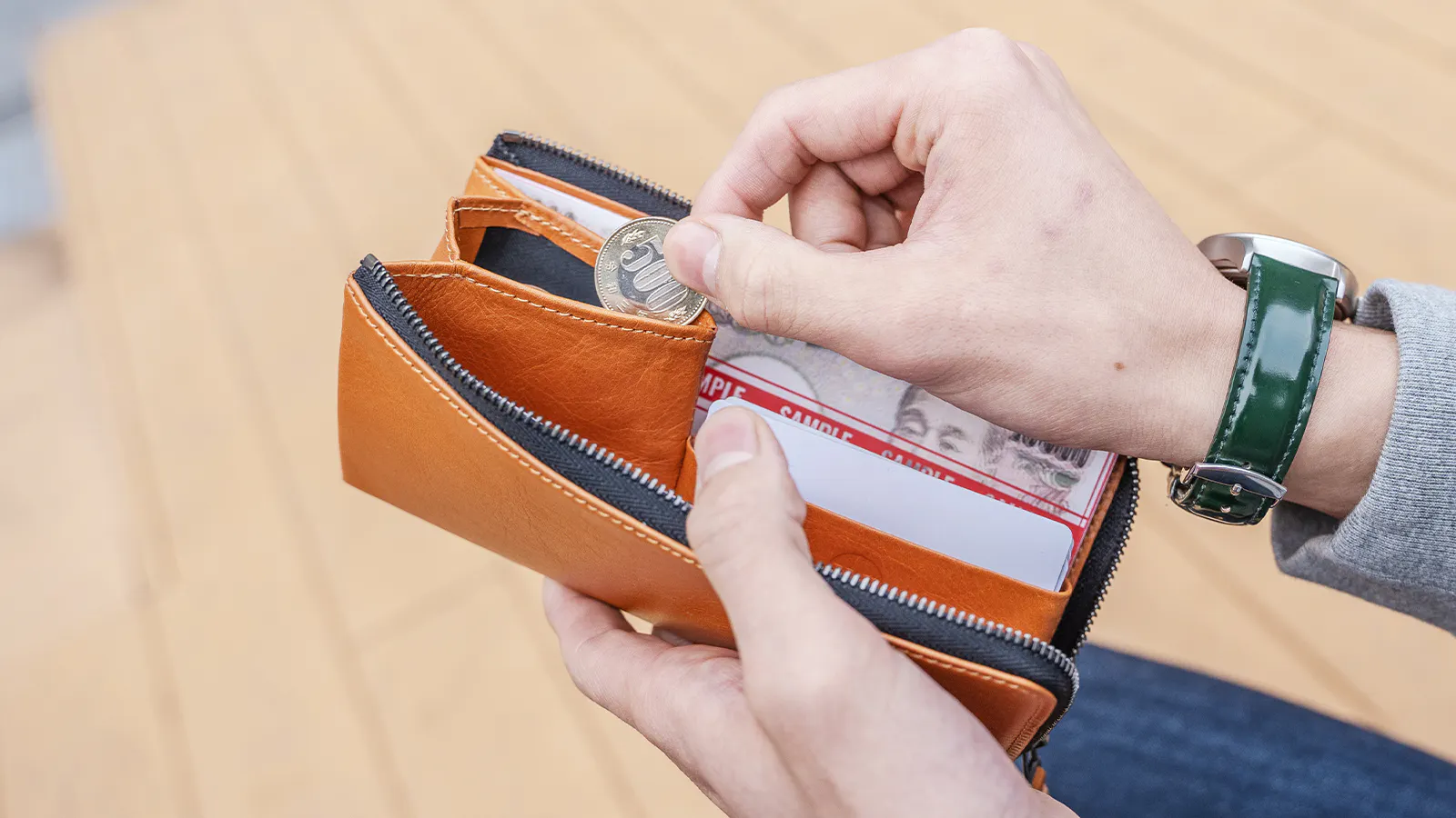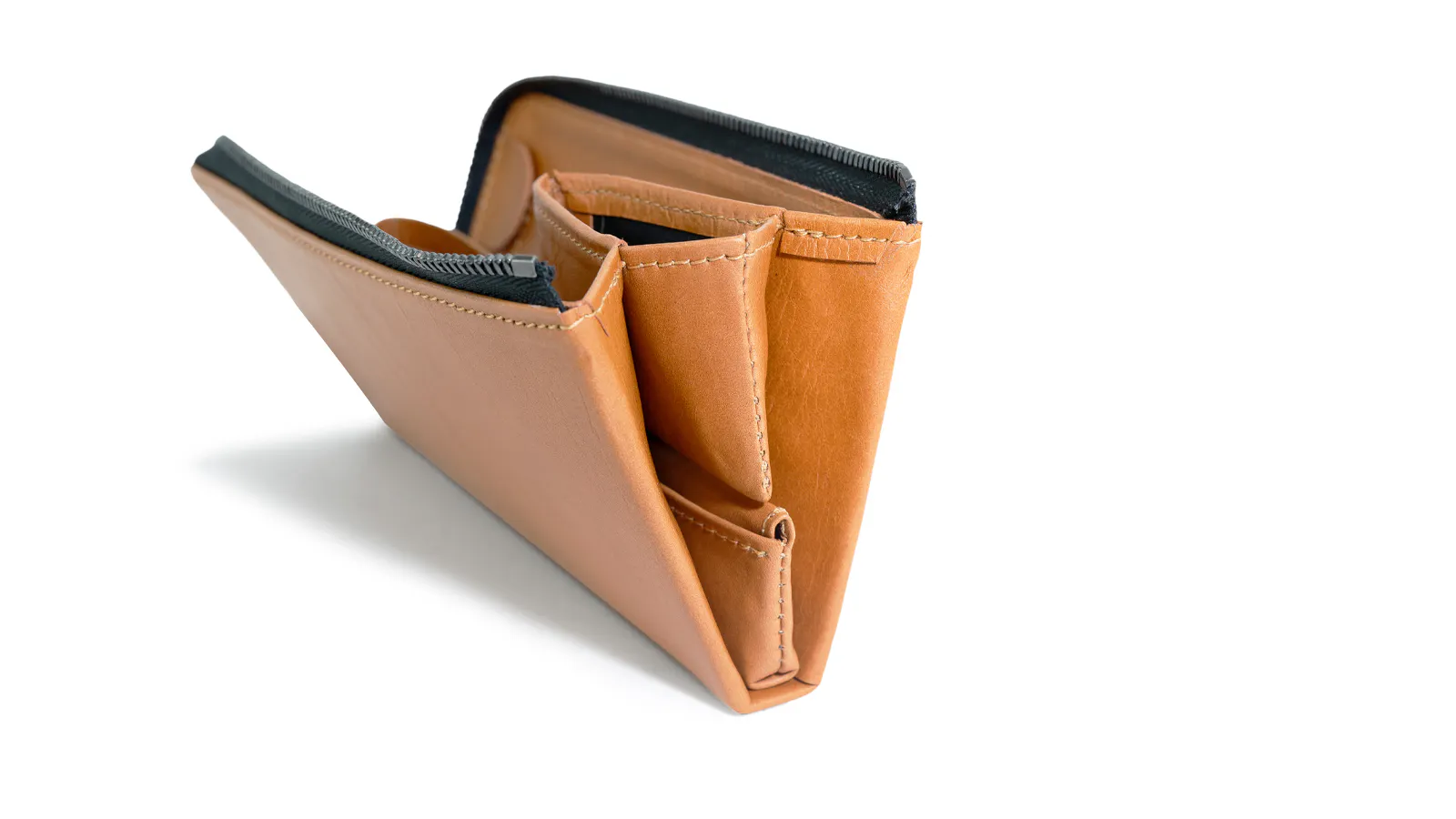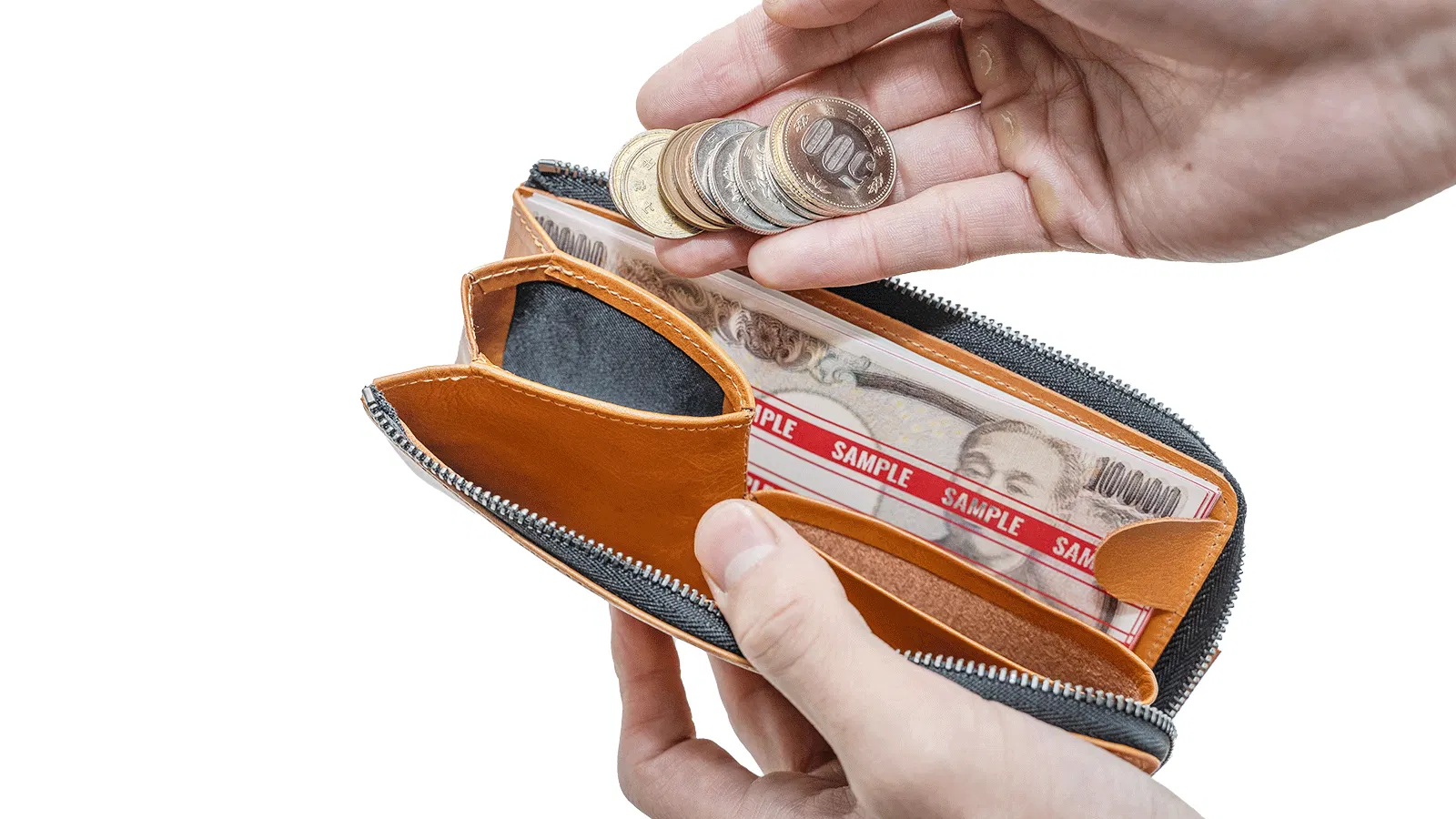 小さなスペースながら一定の量を収納することが可能で、財布を広げると同時に口が広がる構造になっています。