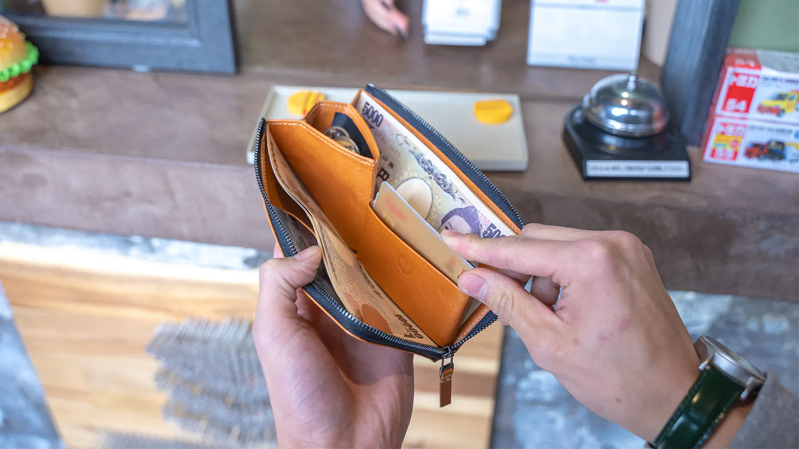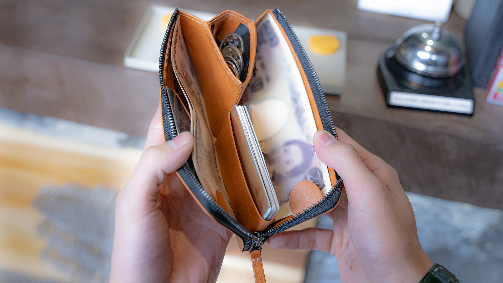 財布を開けると一瞬で全体に目が届き各所へのアクセスがとてもスムーズ。お会計の時短に繋がっています。