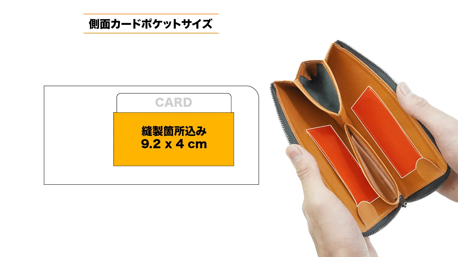 限られたスペースの有効利用で収納力と機能性を高めるように、財布外側の隙間に秘密の収納=シークレットポケットを追加しました。