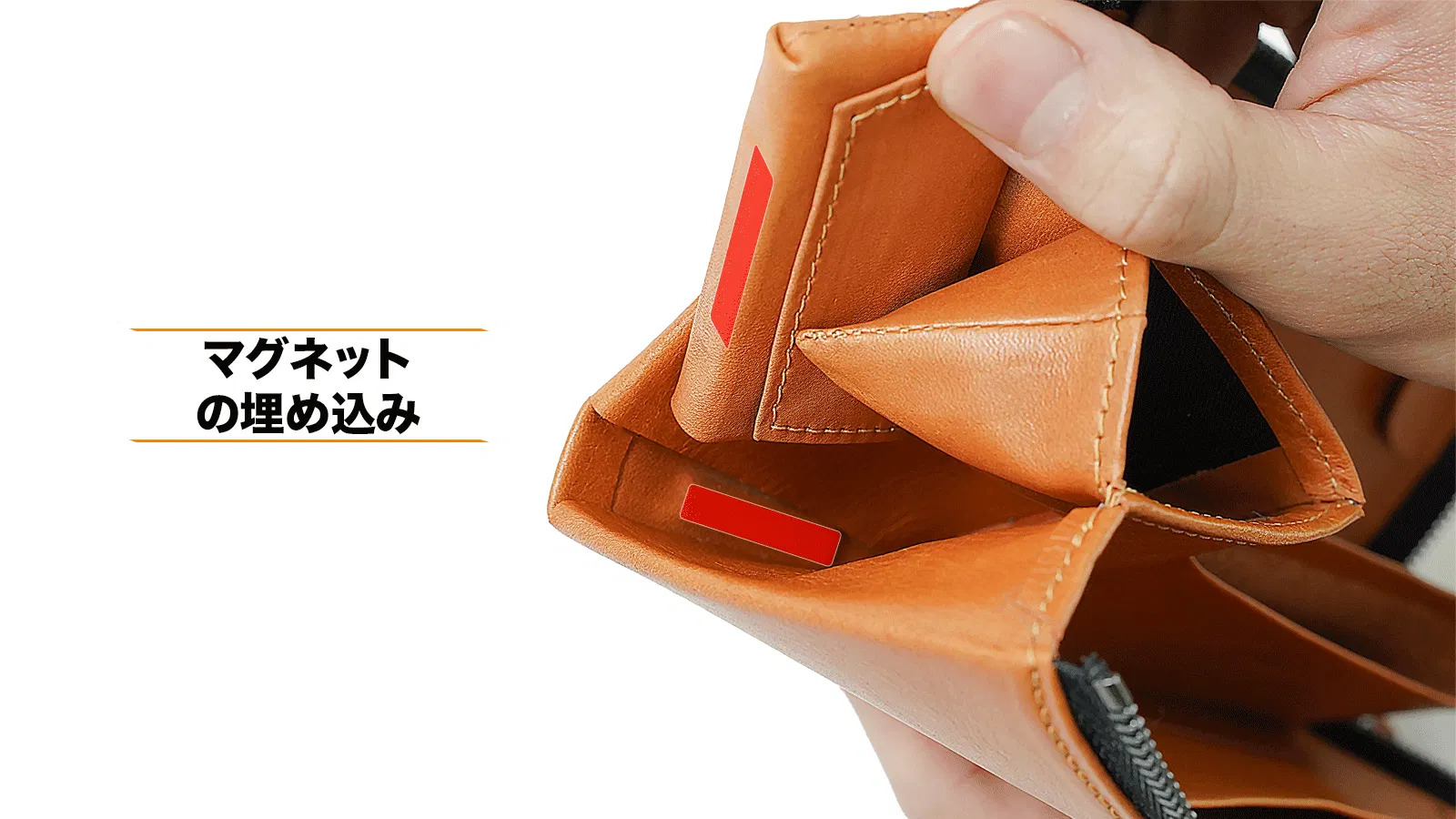 紛失を心配した方もいるかもしれませんが、財布本体とポケットの底に板状の磁石を埋め込んでいるので、隙間に入れた途端にピタッとくっつき合います。