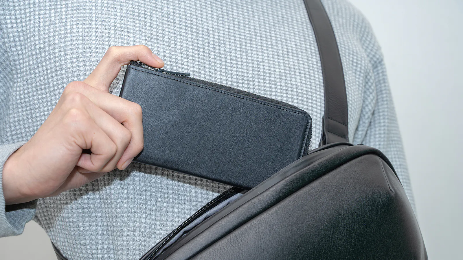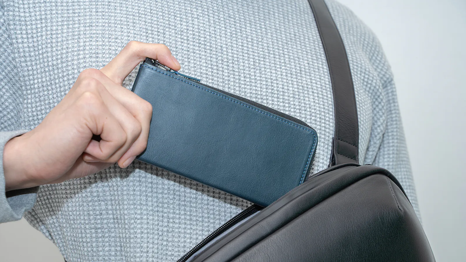 極小サイズを目指したロングウォレットSはオン・オフどちらのスタイルのポケットにも収まりやすくなっています。