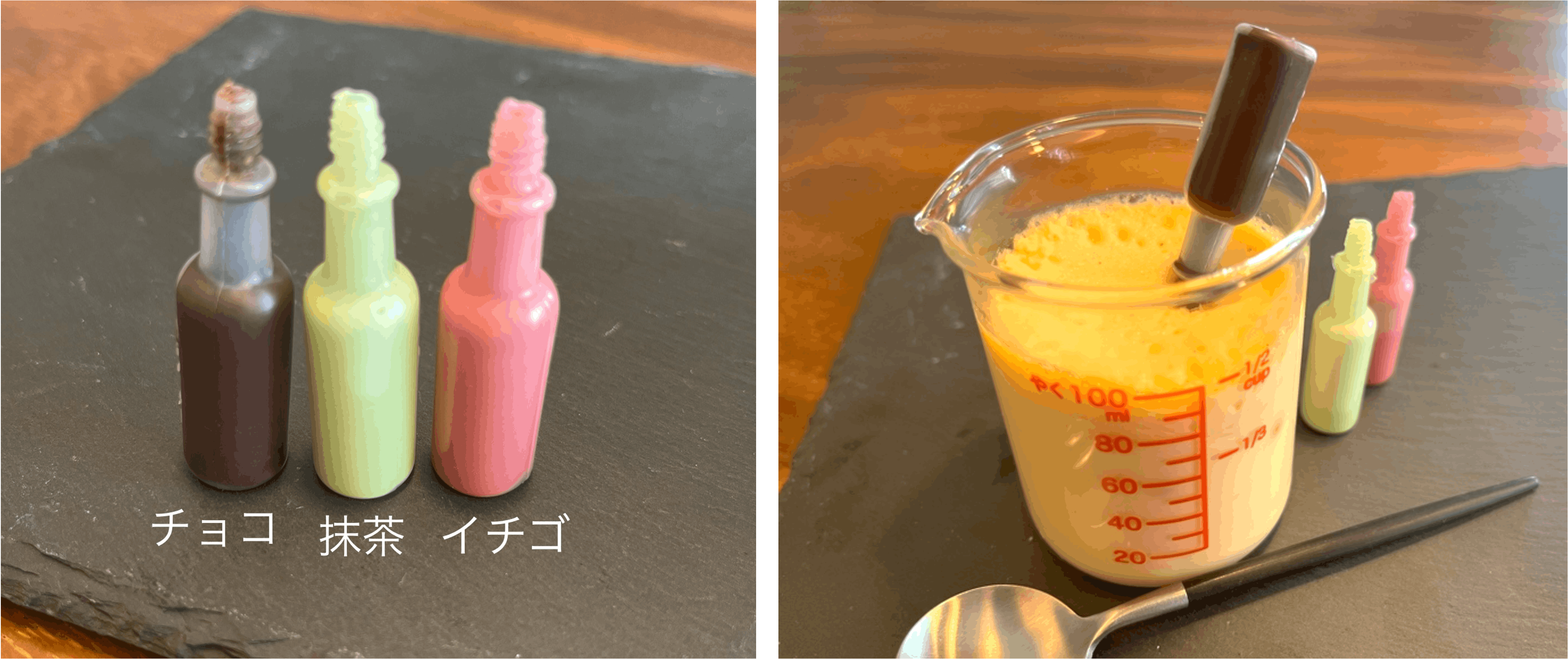 ★2つ目は、プリンとソースが理科の実験スタイルのビーカーとスポイトに入っている面白さです。ターゲットは大人とZ世代で、理科の実験を思い出して大人には懐かしいなー、Z世代にはギャップが楽しくて映えるなーと思って欲しいです。