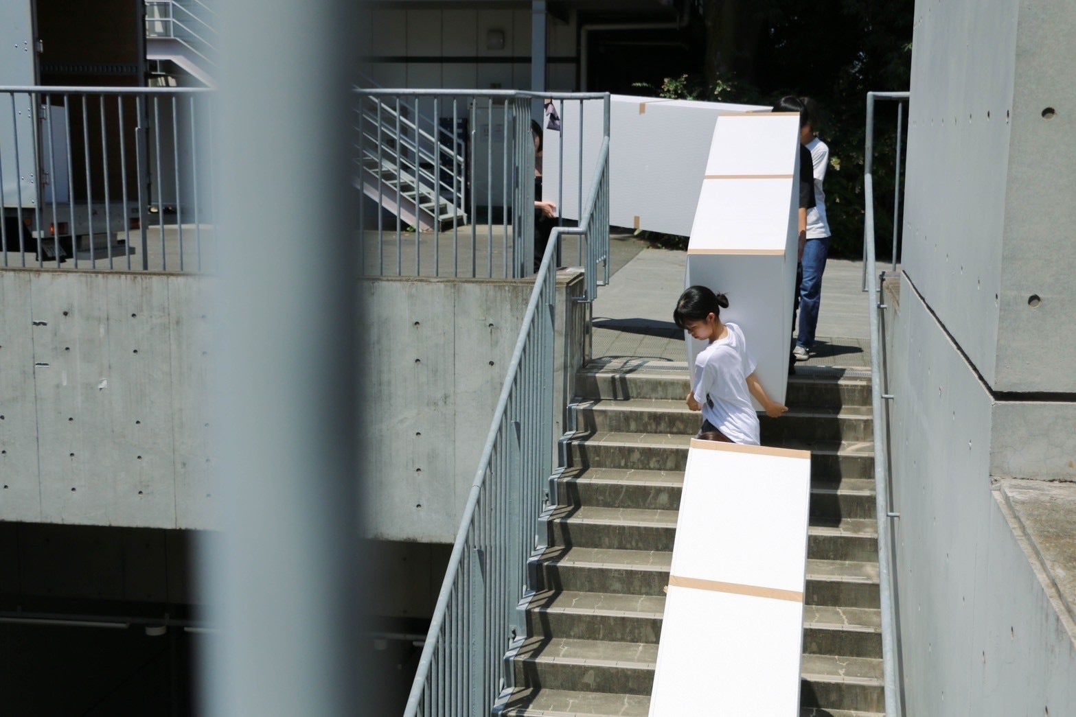 大きさ450mm×900mm×1800mmの巨大発泡スチロールを20名で協力して、えんやこらと、この階段を降りた先にある制作場所まで運びました!