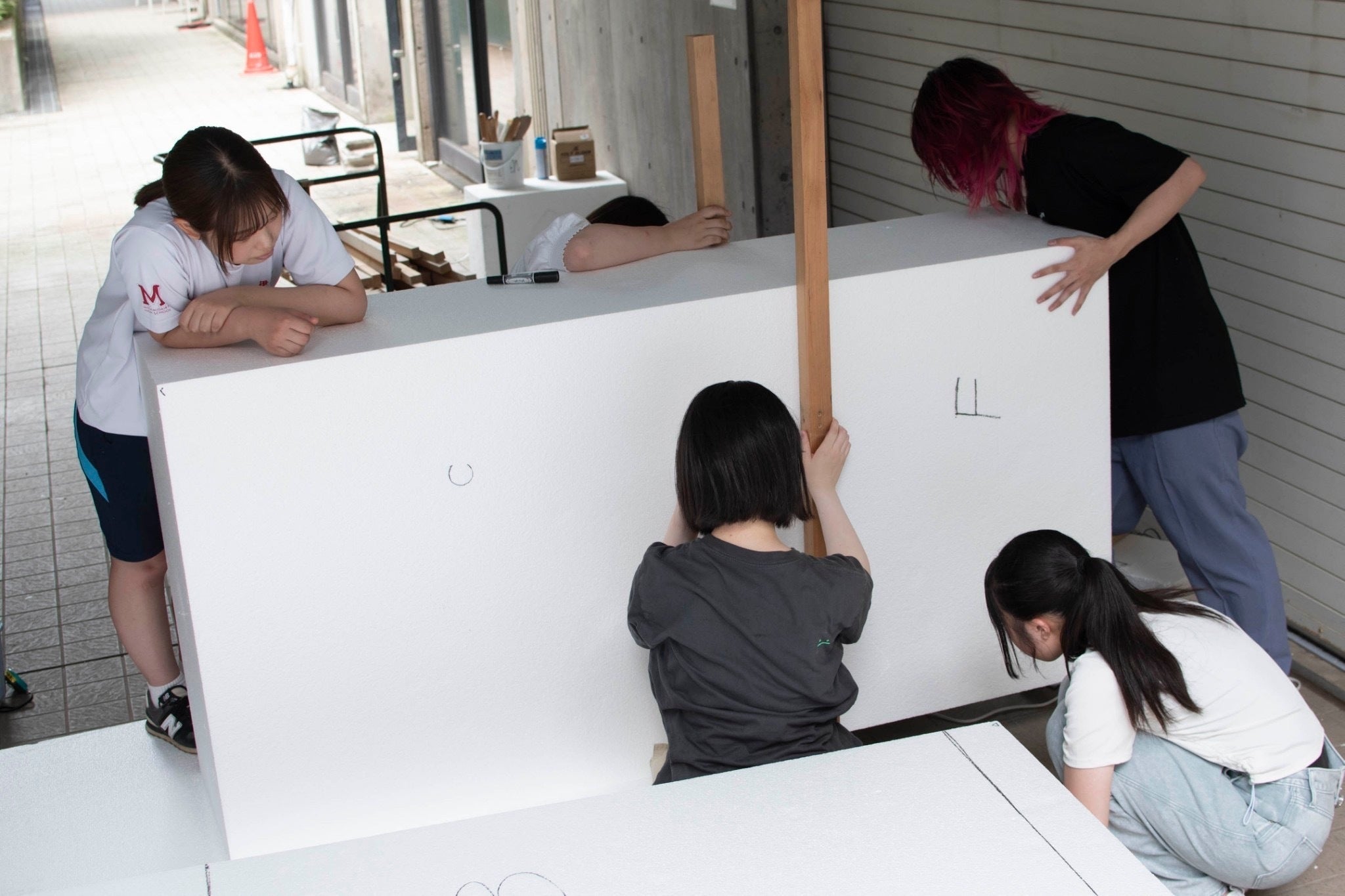 2024年7月26日発泡スチロールのライン取りと切り出しが開始しました!発泡スチロールの塊ををヤドカリにするため、最初の作業は大きくブロックごとに切り出しました!!設計図をもとにメジャーで測りながら、慎重にペンでラインを取っていきます。ラインの他にも、ブロックごとに分けた後、見分けがつくようにアルファベットを一緒に書いていきます。せっせとラインを取る様子作業中、蝶々が遊びに来ました!この引いたラインに沿って、電圧を調整した手作り電熱線カッターで切り出していきます!この作業はカットする人、線が歪まないよう垂木で抑える人、発泡スチロールを支える人の3〜4人で行います。切る前切った後こんな風にスパッと綺麗に切ることができます!この作業をたくさん行なっていきます。同時並行でヤドカリの貝殻の基盤となる木枠も作っていきます!ドライバーとビスで固定していく支えも忘れずに完成!!! たくさんの発泡スチロールと木枠を測って切ることができました!このように、ライン取り・切り出しの作業を繰り返して、少しずつ形にしていきます。
