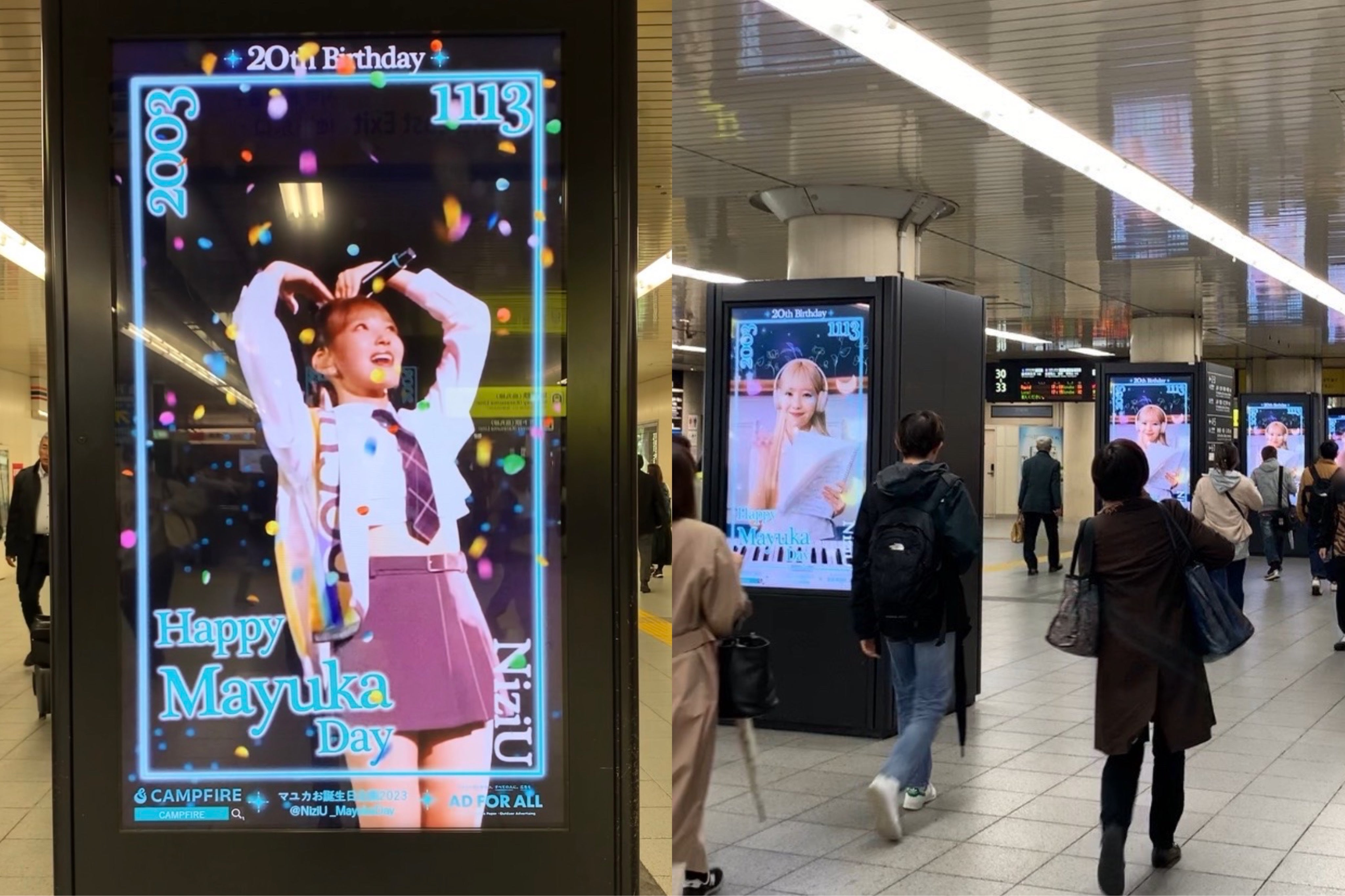2024/12/05 20:00【マユカお誕生日企画 広告掲載終了のご報告】改めまして、 この度は「【11月13日】NiziUマユカちゃん21歳のお誕生日を一緒にお祝いしましょう!」広告クラウドファンディングにご支援いただきまして誠にありがとうございました。昨日12月4日(水)に韓国バスシェルター広告の掲載が終了し、日本・韓国全てのエリアの広告掲載が終了しました。支援者の皆様のおかげで、日本街頭ビジョン1箇所・駅ポスター7箇所、韓国JYP事務所付近バスシェルター広告1箇所、と予定しておりました全てのエリアで広告を出すことができました。SNSでも、たくさんのWithUの方が現地にアクリルスタンドやNIZOOグッズを持って一緒にお写真を撮って投稿してくださいました。また韓国バスシェルター広告におきましては、マユカちゃんが現地へ足を運んで写真を撮ってくれました!ご支援いただいた方のお名前も一緒に写っていて嬉しかったです!以下に、日本と韓国の広告掲載画像を添付いたします。◆街頭ビジョン広告◆【東京 新宿ユニカビジョン 11/11(月)〜11/17(日) 7日間 15秒×8回/時】◆日本国内 駅ポスター広告◆全エリア 11/11(月)〜11/17(日) 7日間【札幌・名古屋エリア】【仙台・博多エリア】【東京・大阪エリア】【京都エリア】◆韓国 バスシェルター広告◆11/5(火)〜12/4(水) 30日間ハニャン スジャイン アパート Hanyang Sujain Apt. 한양수자인아파트 25-286以上、日本と韓国の広告掲載のご報告でした。ご支援いただきまして誠にありがとうございました。 もっと見る【重要】動画広告についてのお知らせ