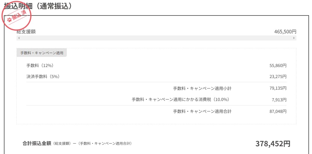 合計振込金額(総支援額)ー(手数料・キャンペーン適用合計)