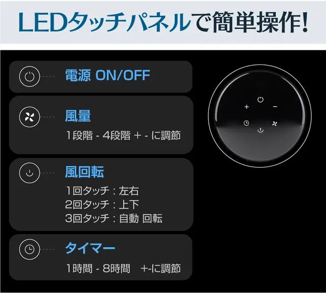 TELLO ZETの簡単なLEDタッチスクリーンディスプレイは、軽いタッチだけで操作することができます。 操作部には様々なオプションを提供し、電源のオン/オフ、速度設定の変更、回転、タイマーの簡単な設定が可能です。