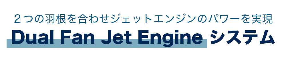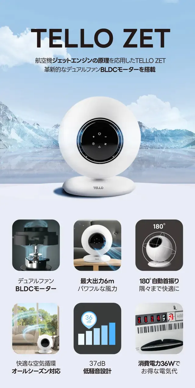 TELLO ZETはジェットエンジンの原理を応用し、空気を強力に吸い込み、そして排出します。独自の「Dual Fan(二重羽根)」システムにより、効率的に室内の空気を循環させ、より広い空間の隅々まで空気を届け循環させます。