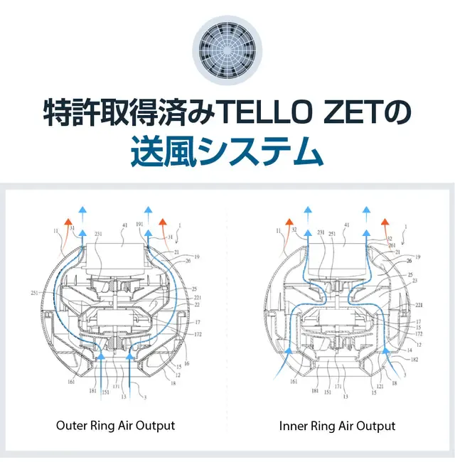 TELLO ZETのDual Fan(二重羽根)」システムは日本とアメリカ、韓国や様々な国で特許を取得しています。