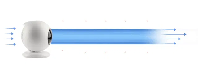 このメカニズムは、装置の向こうに広がる高圧円筒形の流れを生成し経路に沿って周辺の空気を引き寄せて自然に循環効果を生み出します。