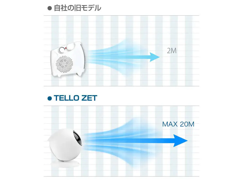 TELLO ZETのDual Fan(二重羽根)」の送風能力は空気を吸い込んで圧縮した後、強く噴射することで、さらに遠い「最大20M」離れたところまで、空気を循環させることができます。