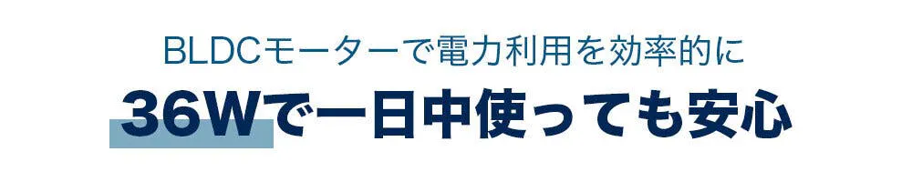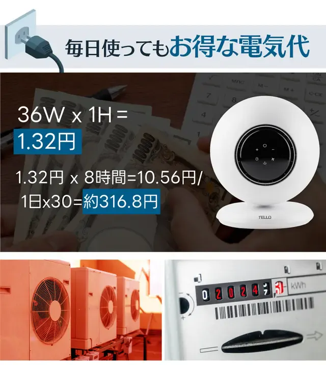 TELLO ZETは効率的な空気循環だけでなく、小さなエネルギーで高い効率性を誇ります。最小消費電力が36Wに過ぎないので、毎日8時間ずつ1ヶ月使っても電気代は約316.8円で定食1食分より安い電気代で、電気代の負担なく一日中涼しく過ごせます。