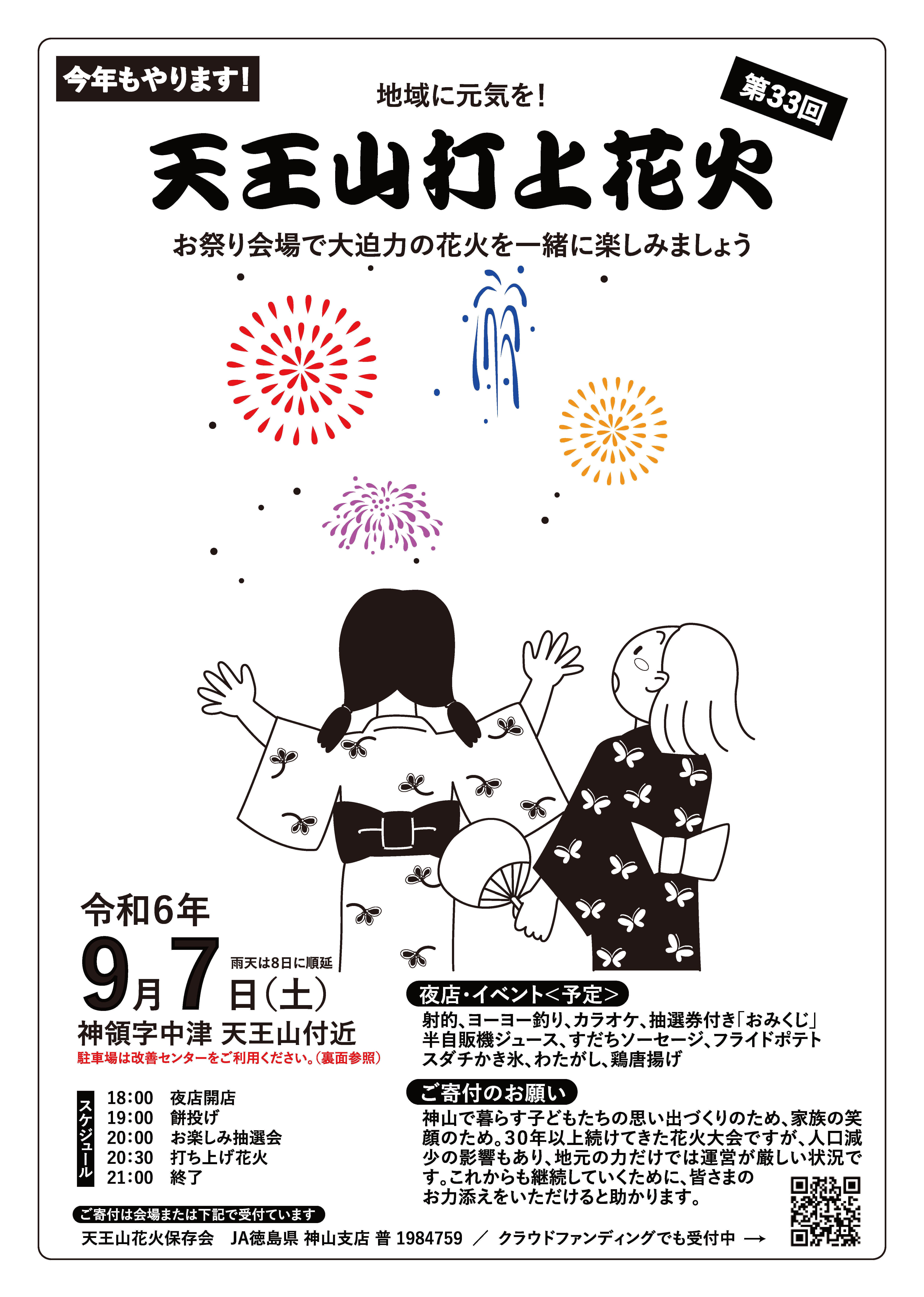 2024/08/10 08:04花火大会のチラシが完成しました。開催日時は9月7日(土)18時からで、花火の打ち上げは20時30分を予定しています。地元保存会による出店には、射的やフライドポテト、半自動販売機(手動?)によるジュースの販売など、工夫をこらしたものがたくさんあります。また、NPO法人里山みらいからは新作!スダチのかき氷や城西高校神山校の寮生による鶏のから揚げ、その他有志によるソーセージやヨーヨー釣り、わたがしなどが準備されています。さらに、お楽しみ抽選会では地元店舗様の協力により、温泉無料入浴券などたくさんの商品を用意させていただきました。当日はぜひ、ご近所お友達お誘い合わせの上、ご来場ください。スタッフ一同お待ちしております。 もっと見る