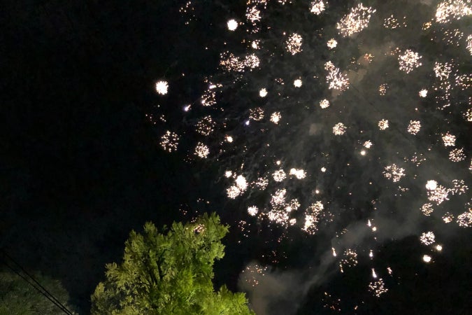 山がちなこの地域の地形を活かし、神社の境内に集まって木々の隙間から夜空を見上げると、近距離で迫力のある花火を楽しむことができ、とても人気です。