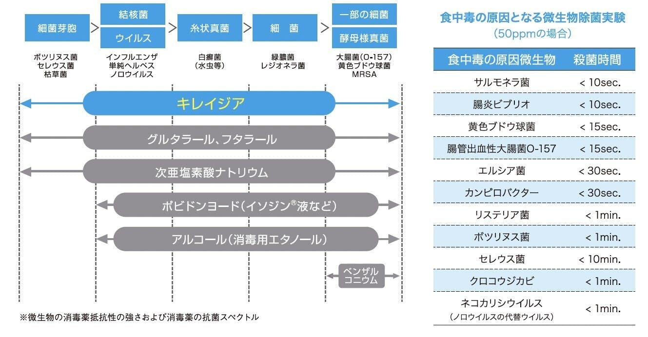 キレイジアは、従来のアルコールや消毒剤では対処が困難だった細菌やウイルス、カビなどの人体に有害な微生物を、確実で即効性のある最高レベルの除菌力で防ぎます。