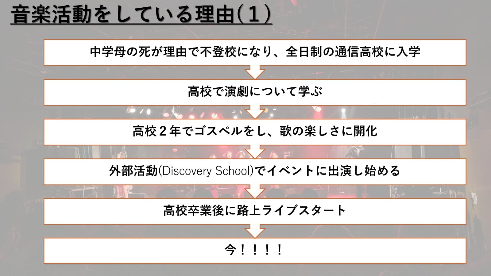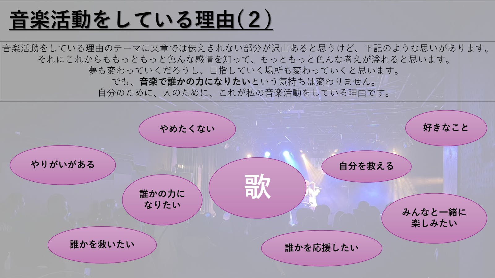 - そう思えるようになれたのは、周りの友達、家族、そして音楽、これらの助けてくれる存在があったからです。