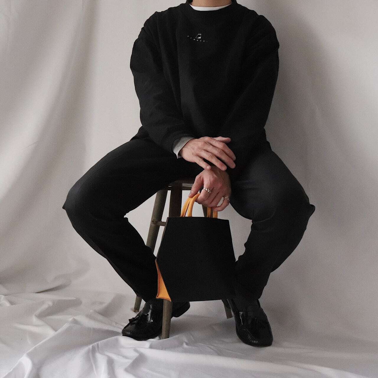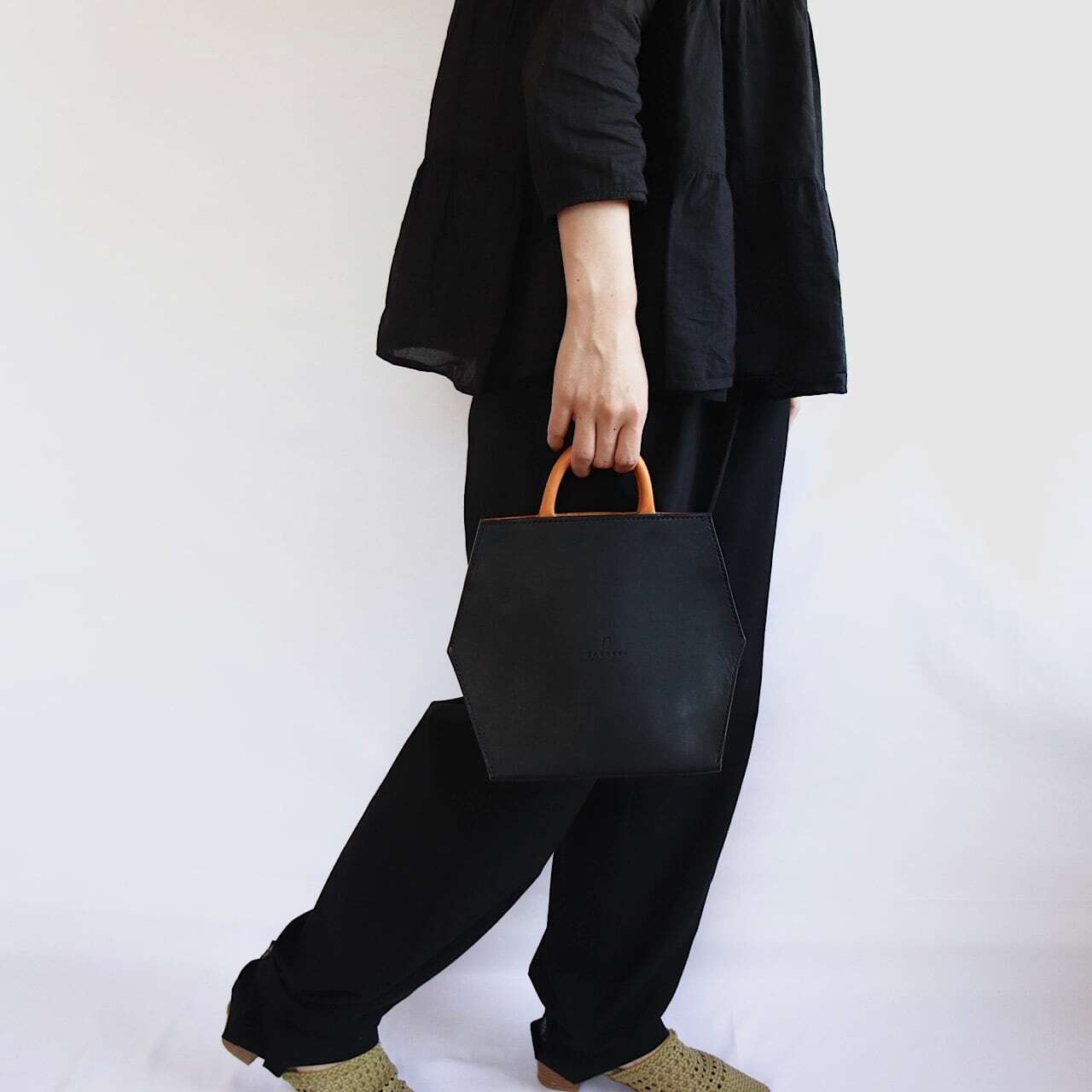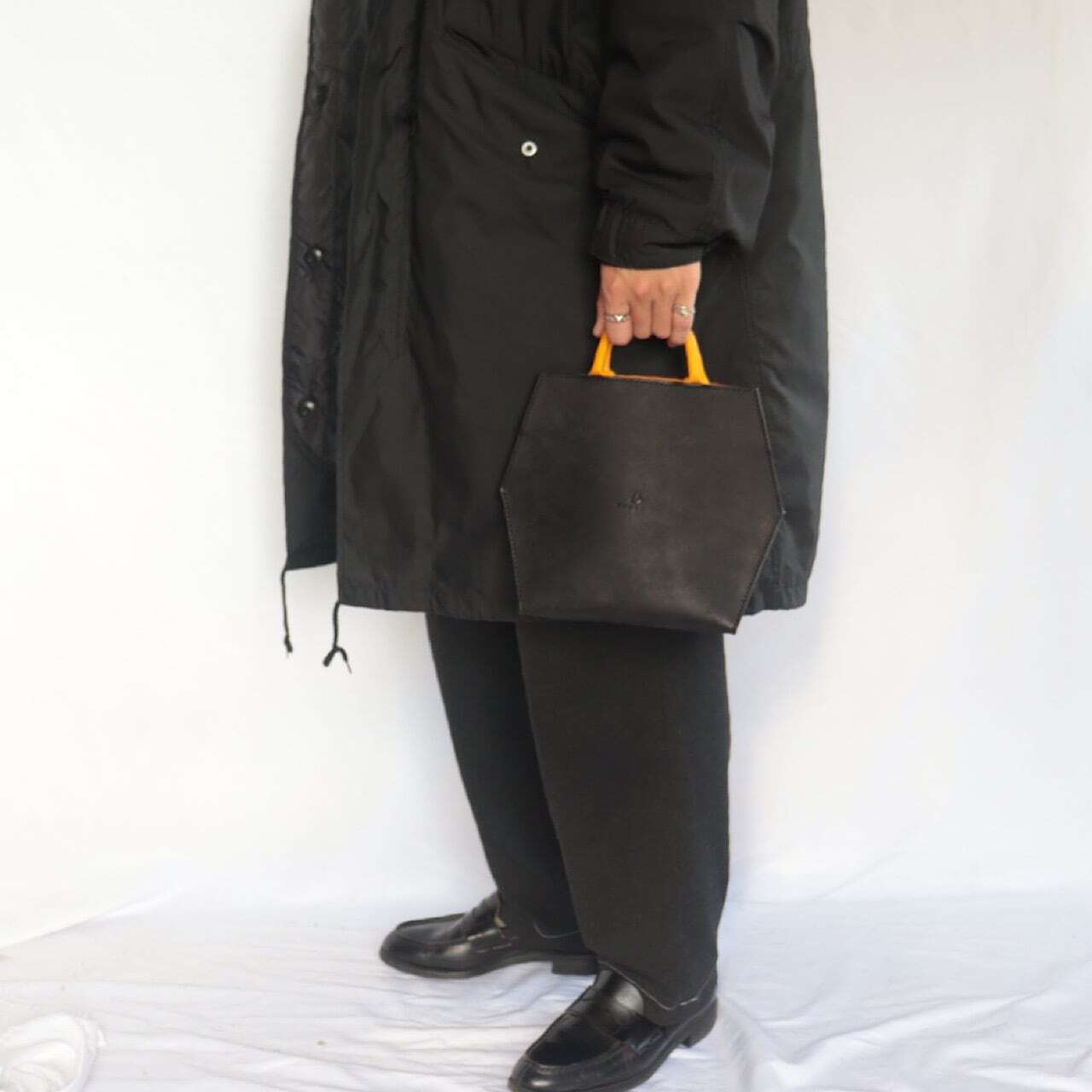 ブラックのワントーンコーデに足元と手元へさりげない差し色を加えました。