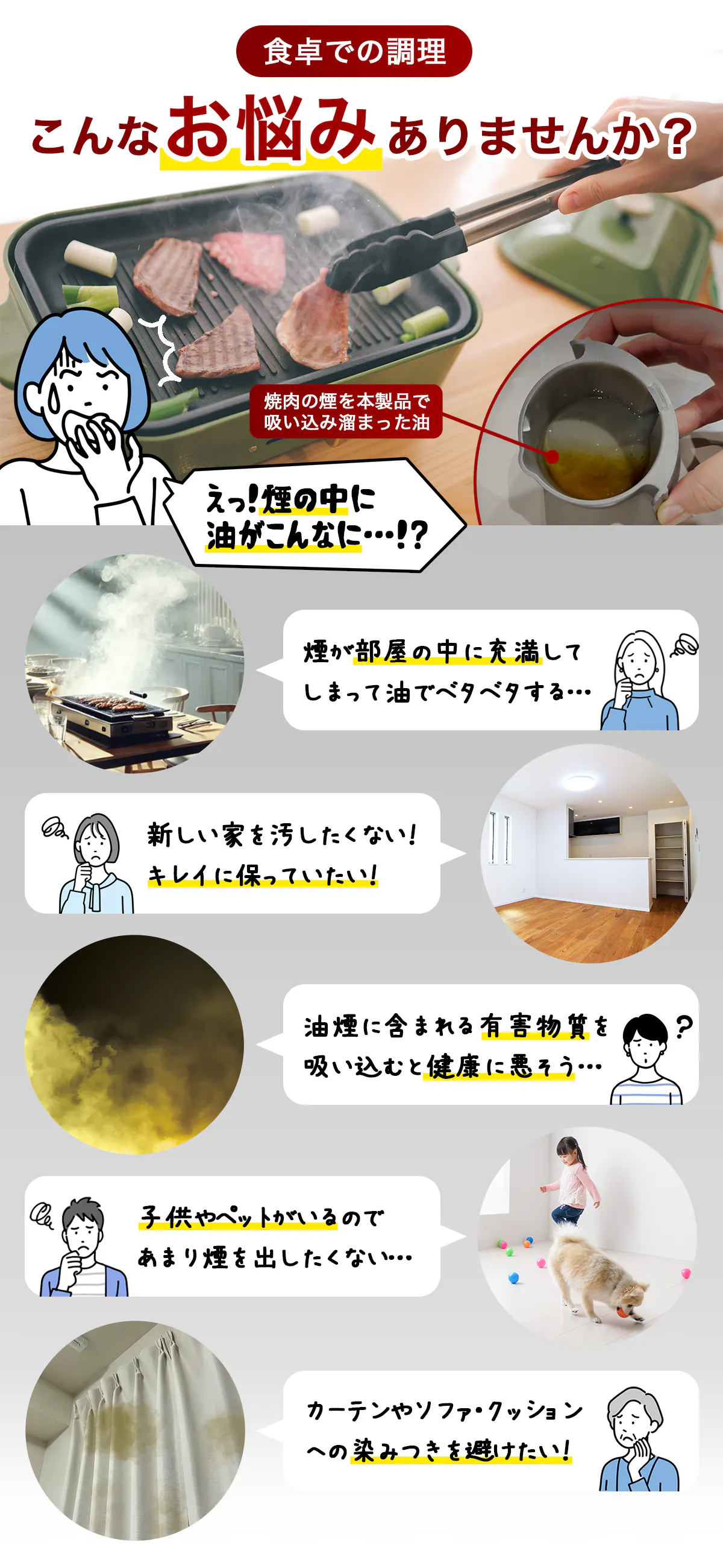 煙や水分の粒子を素早く多量に捕捉できます。吸い込んだ油煙は4層フィルターを通して浄化され、清浄な空気として後方の排気口から排出されます。これにより、油煙が部屋全体に広がる問題を効果的に解決します。