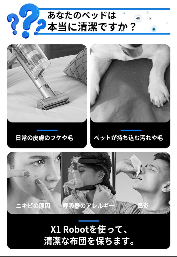 X1 Robotを使って、お悩みを解決します。いつでも布団を清潔に保つことができます!ワンボタンで面倒な布団のお掃除を楽々完了できます。