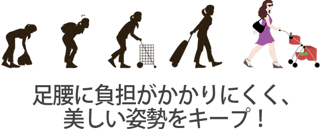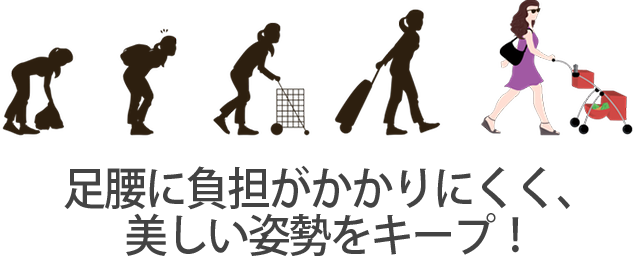 重たいものを運んでも快適な高さに設計されているため、足腰に負担がかかりにくく、美しい姿勢をキープ!ショッピングをエクササイズに!