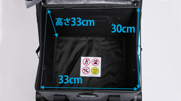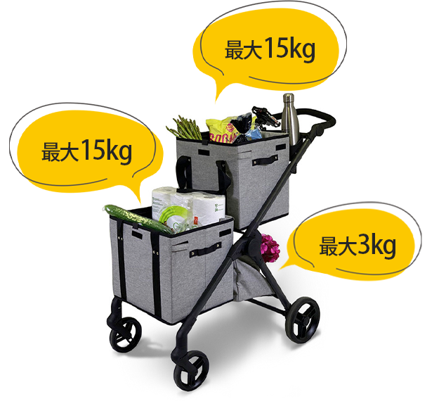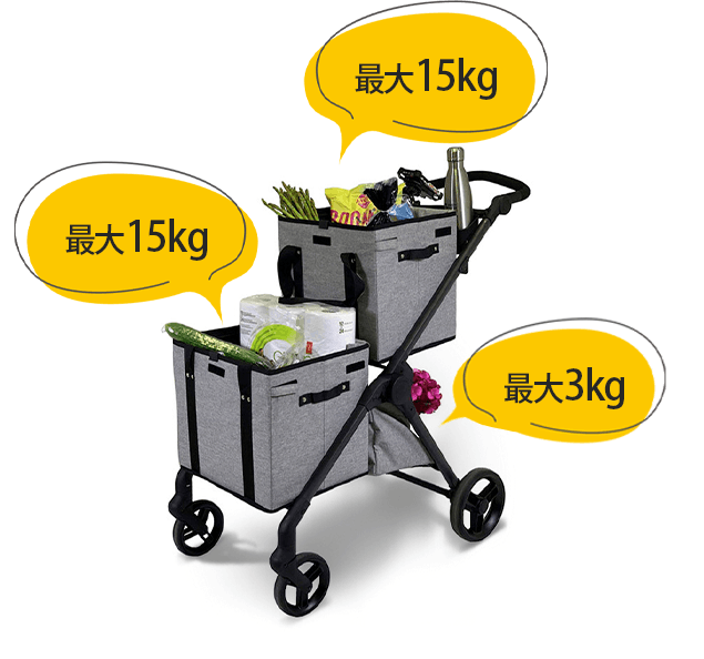 2段のバスケットにはそれぞれ最大15kgの荷物を積むことができ