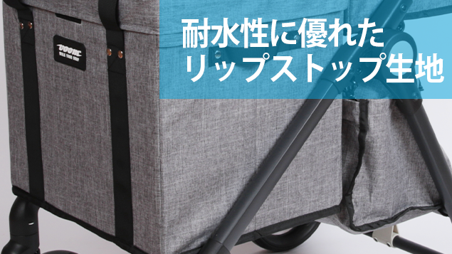 付属のバスケットとVOOMcartの布部分には耐水性に優れたテントやレインウェアなどで使用されるリップストップ生地を使用しています。