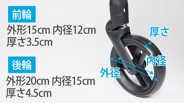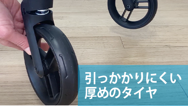 厚めに作られたタイヤで、網目の側溝や踏切などの凹みに引っ掛かりにくい構造。