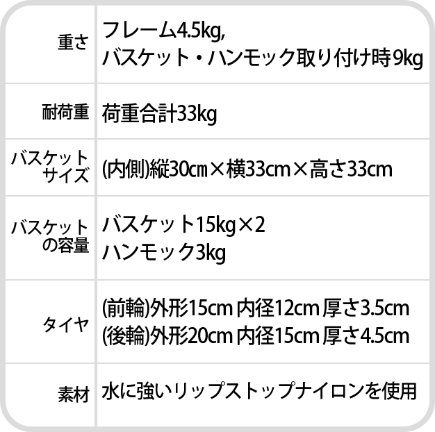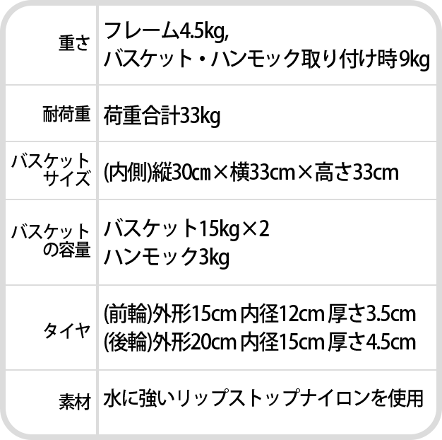 合計33kg(バスケット15kg×2・ハンモック3kg)まで運べます。