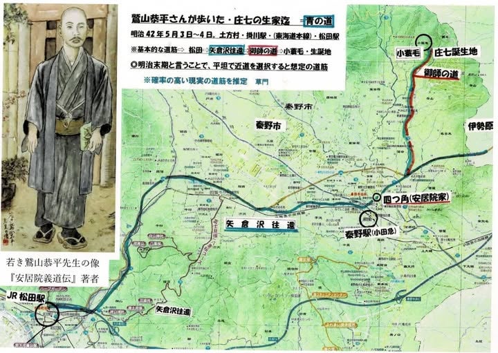 裏表紙は松田町草門隆氏に地図の上に「御師の道」「矢倉沢往還」を線で示してもらったものです。絵は大須賀義明氏に描いてもらった「若き鷲山恭平先生の絵」です。「安居院義道伝」著者鷲山恭平氏が若い時に松田から蓑毛まで歩いた道が分かります。