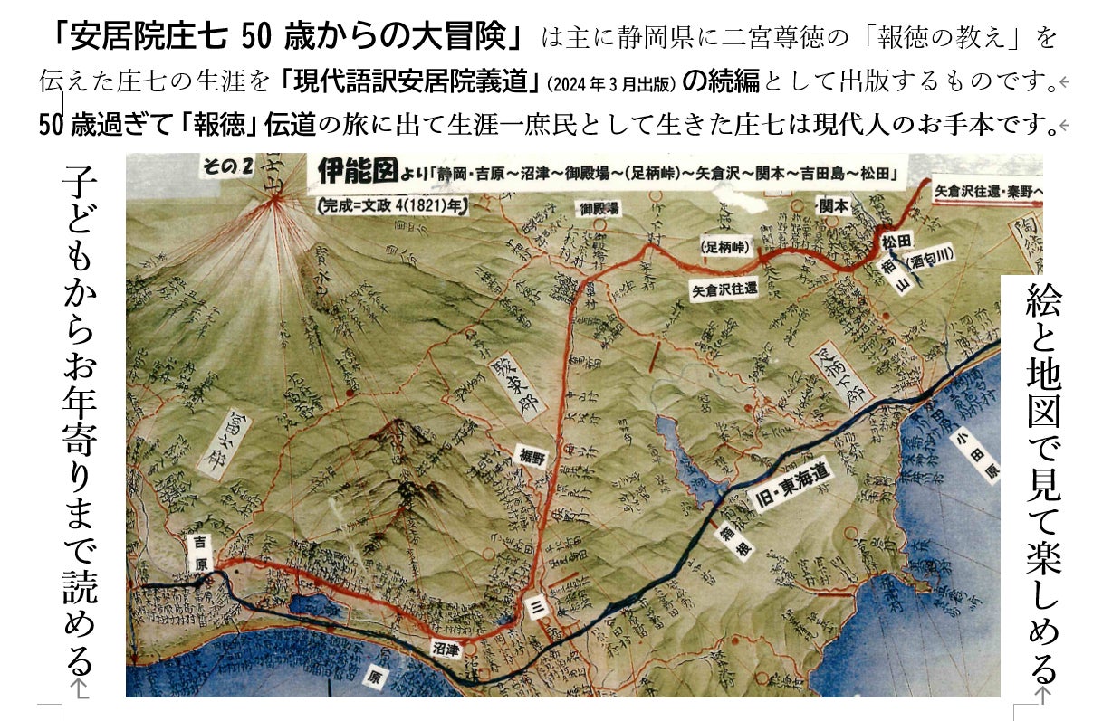 「現代語訳 安居院義道」は、図書館だけでなく、庄七出身地の秦野市・足柄上郡及び遠州報徳を普及させた静岡県各市町教育委員会を通じて小学校中学校に寄贈しました。ところが教育委員会担当者によっては「小学生には難しすぎる」と難色を示されました。そこで今回「子どもからお年寄りまで」「絵と地図で楽しめる」をコンセプトに、新たに絵や写真を多く収録したA4横版150頁程度の本を出版しようとするものです。