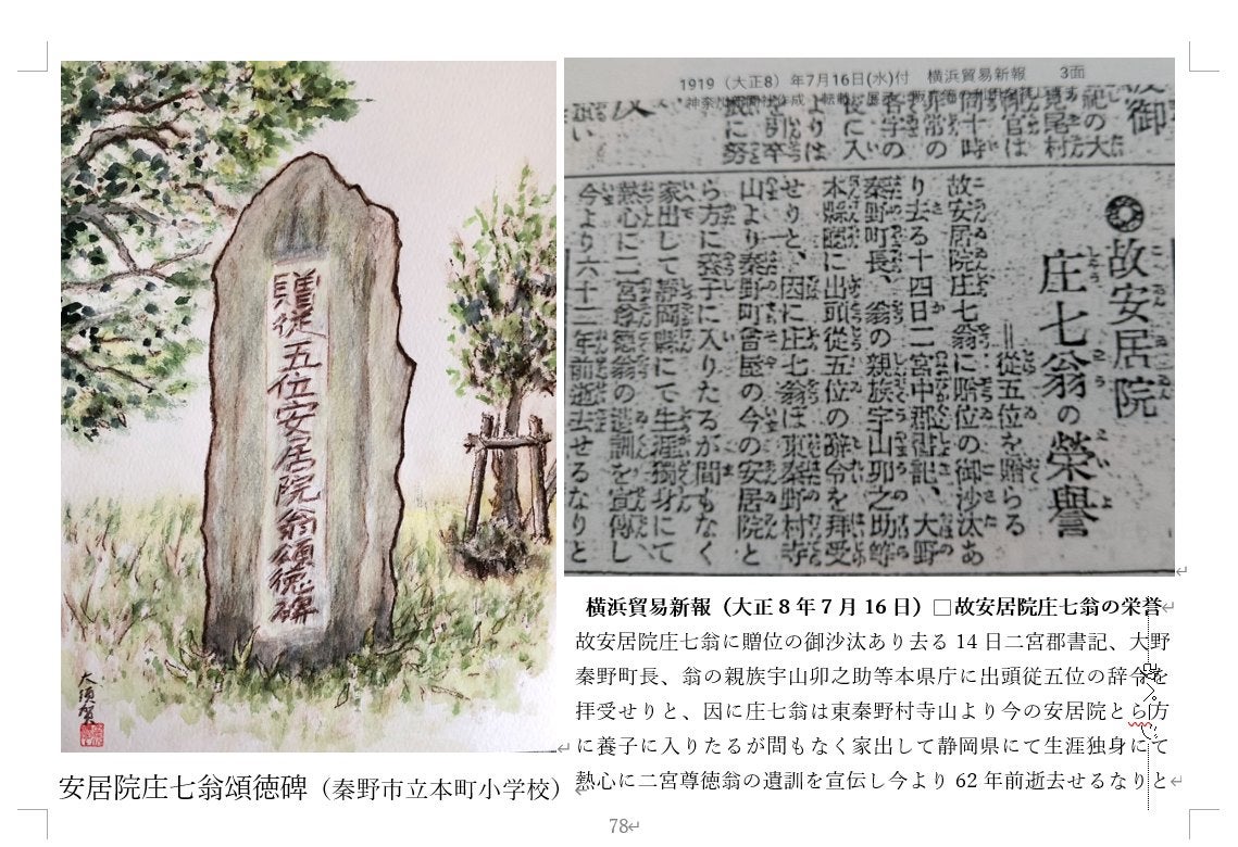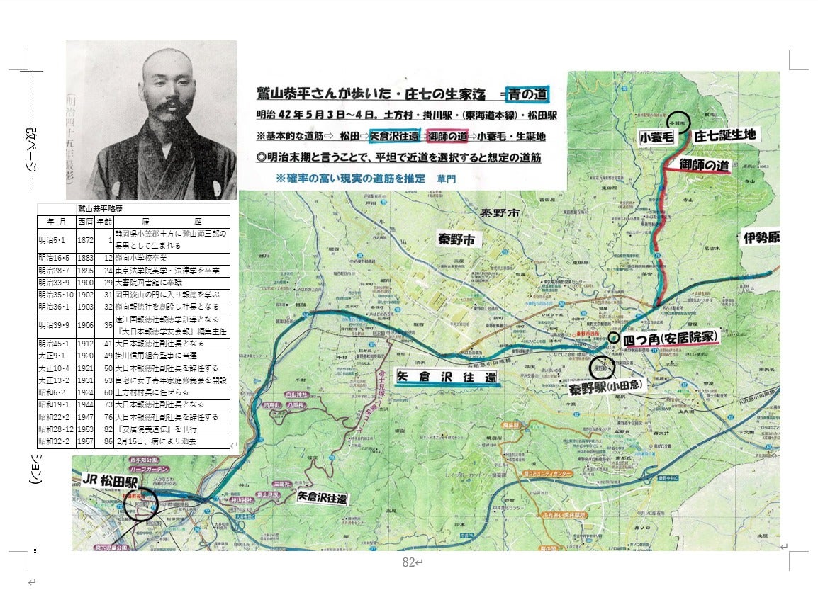 また、本書で鷲山恭平氏について 「40 鷲山恭平氏著『報徳開拓者 安居院義道』と庄七の道」の項目でその業績をたたえると共に地図で恭平さんが歩いた道を想定しました。