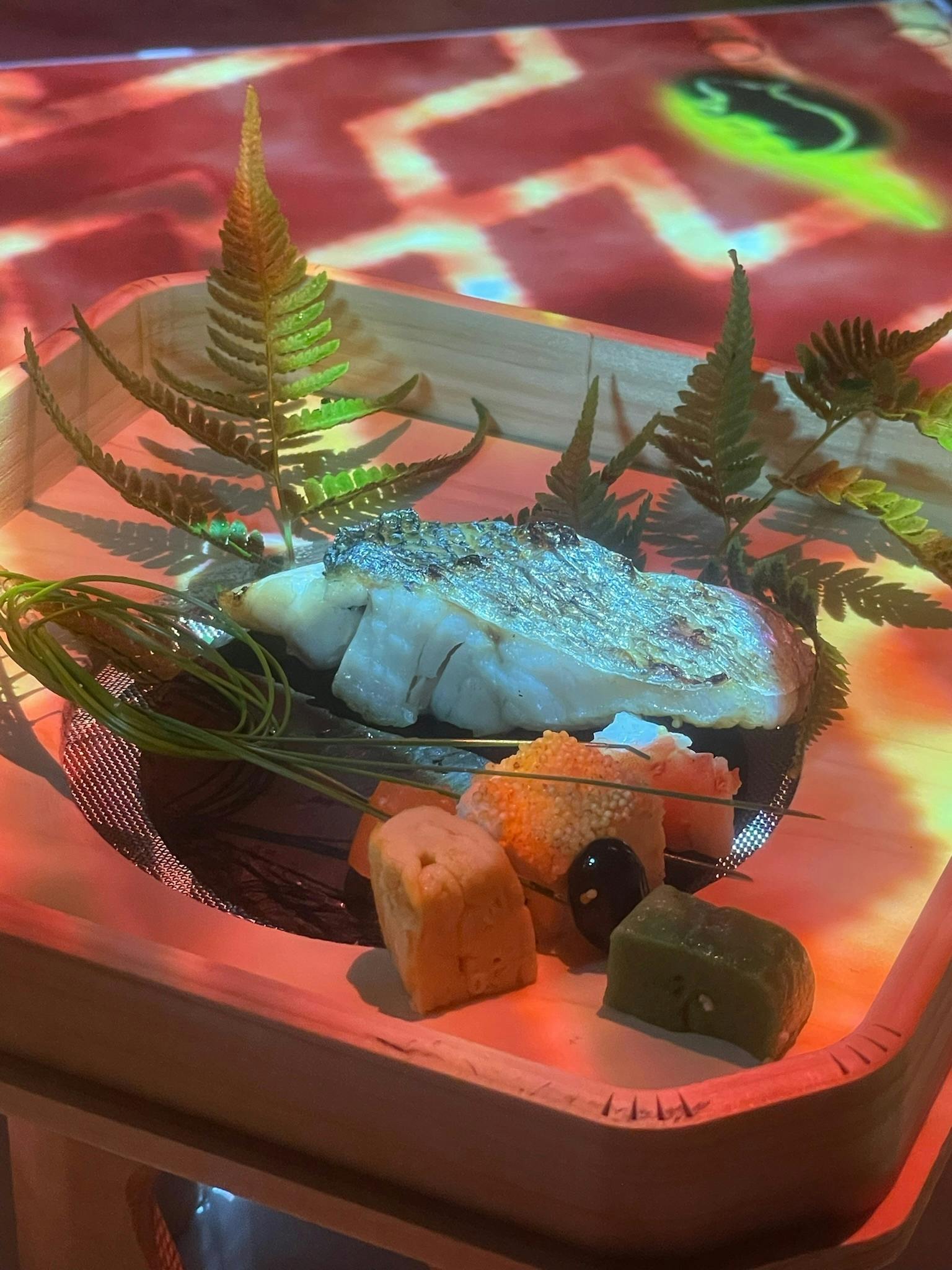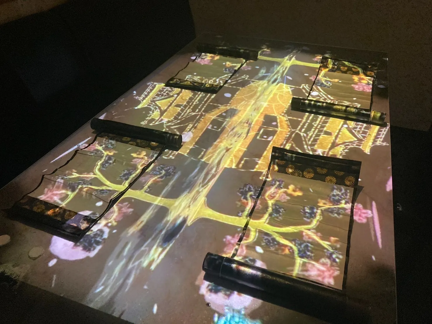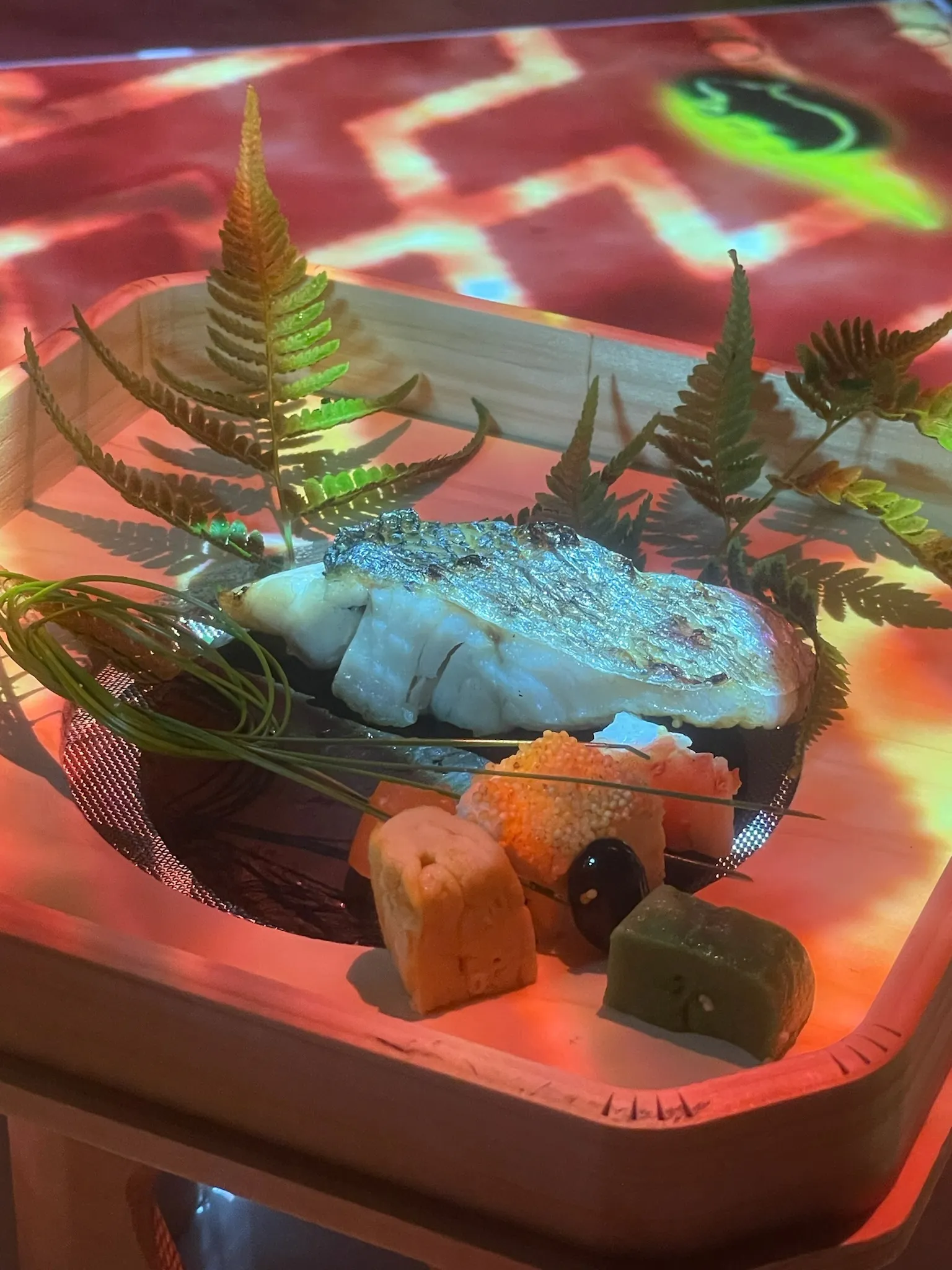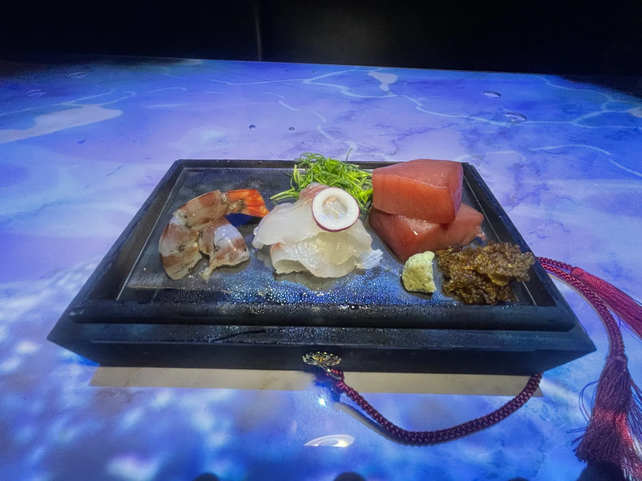 市場で購入した、その日の1番いい魚を使用しております。魚は旬のものを使用しているので、その時によって違う魚をお楽しみいただけます。また、竜宮城にちなんでいる、玉手箱の様な器にもご注目ください。こちらのシーンでは、右の写真のようにお話が映し出される巻物に指を置いていただくことで、お話の中に入り込んだかのような体験をしていただくことができます